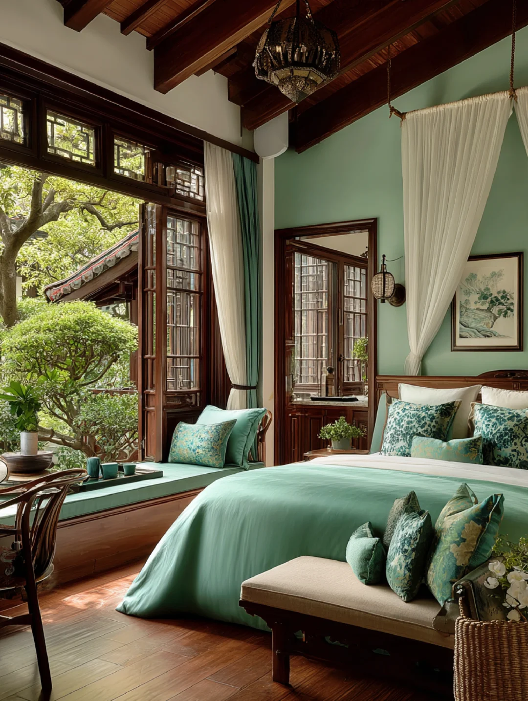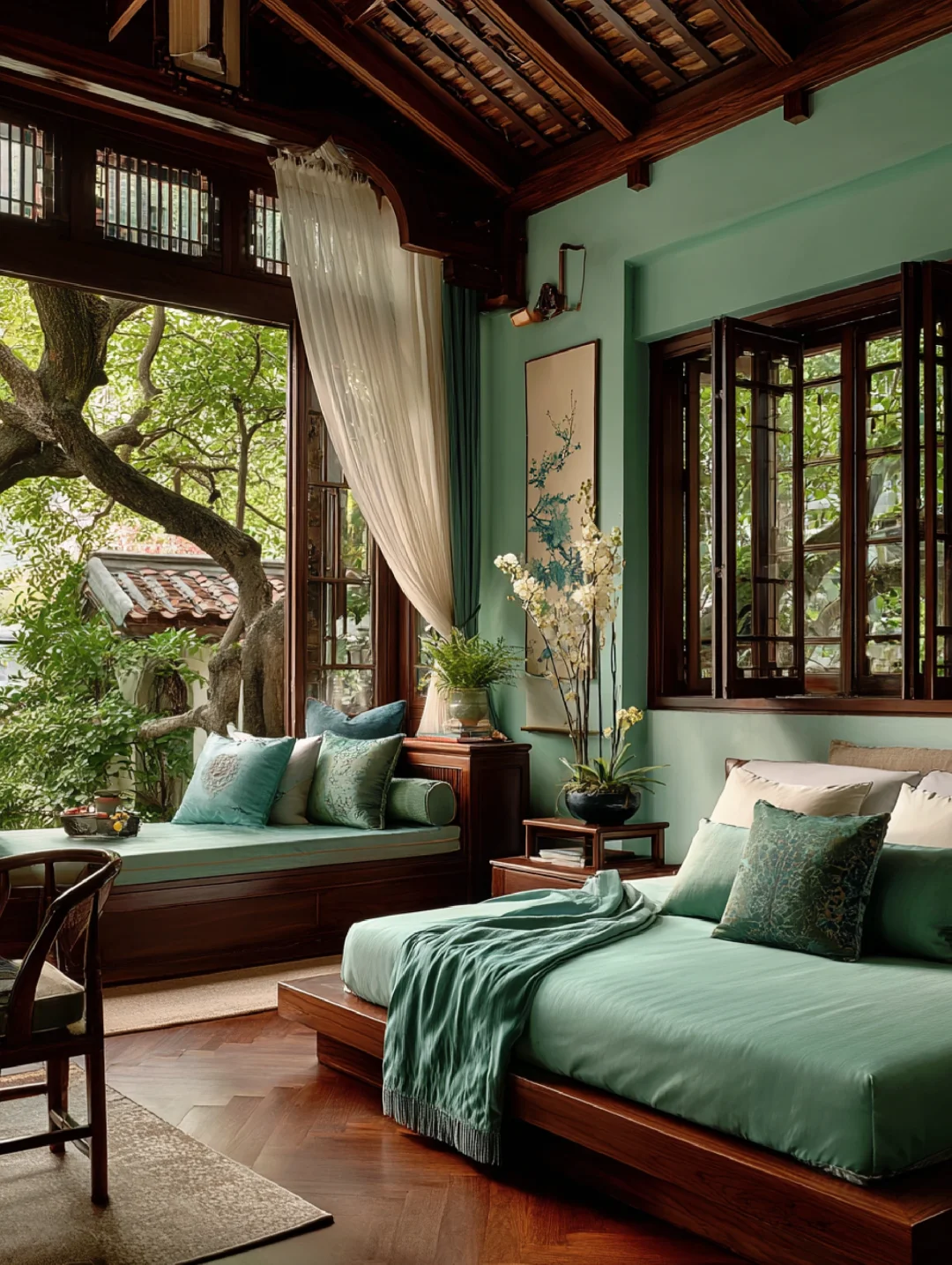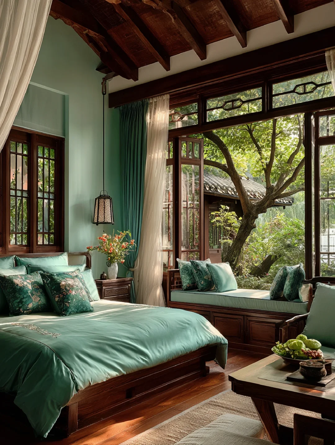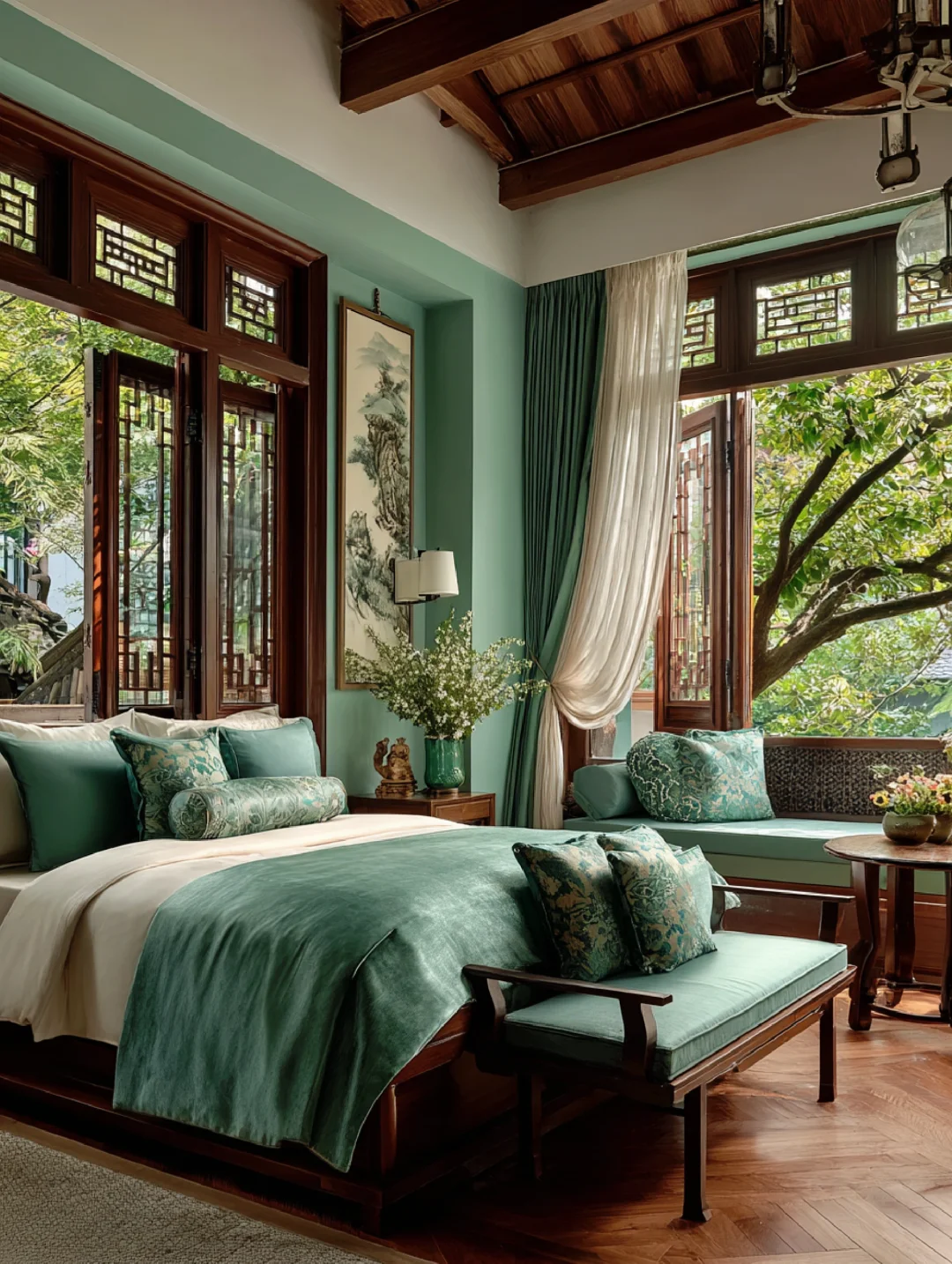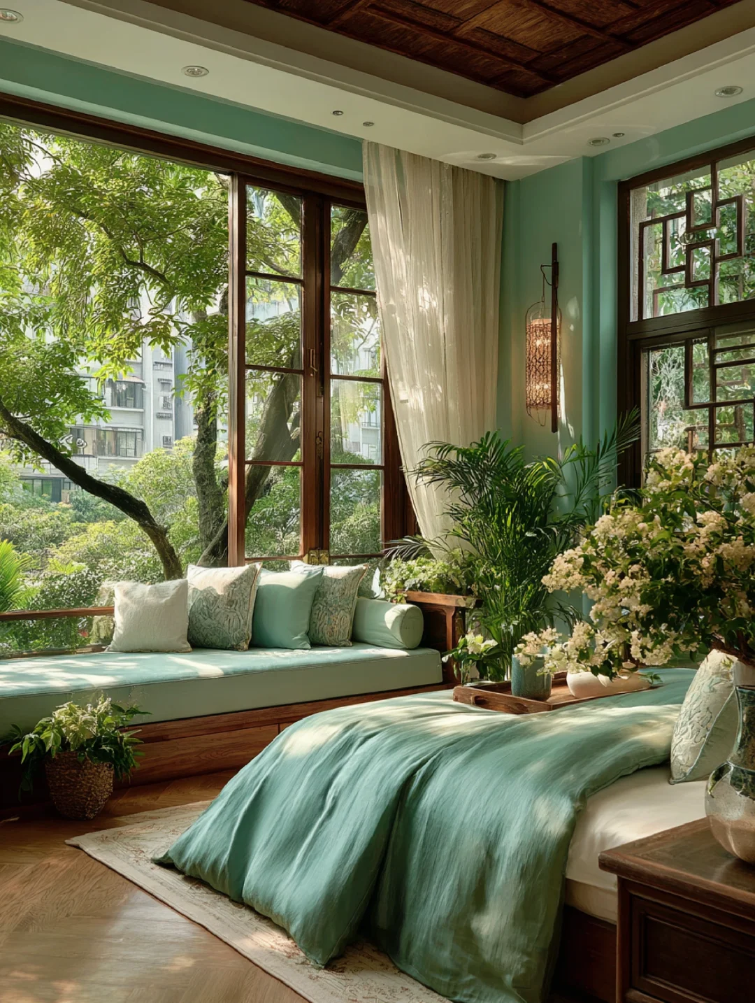 推开门那刻!呼吸都变轻了🍃 水墨浅青的墙面上,绿树与阳光共舞 浅青丝绢床品像一汪春水淌进心尖 新中式的清冷感里,居然藏着温柔暴击✨ 原来新中式不止有红木的厚重 当浅青撞上水墨 竟然美成了一首宋词 【作品为ai辅助创作】