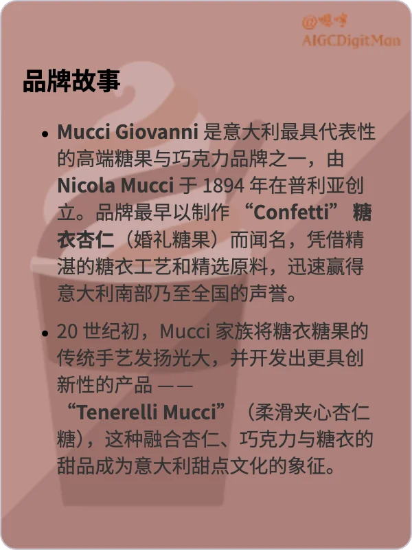 Mucci Giovanni 是意大利最具代表性的高端糖果与巧克力品牌之一,由 Nicola Mucci 于 1894 年在普利亚创立。