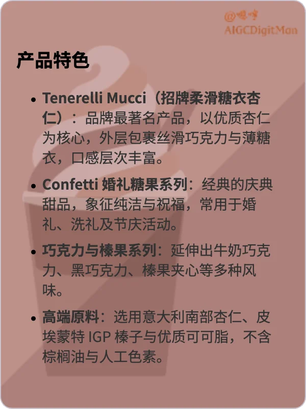 Tenerelli Mucci(招牌柔滑糖衣杏仁):品牌最著名产品,以优质杏仁为核心,外层包裹丝滑巧克力与薄糖衣,口感层次丰富。