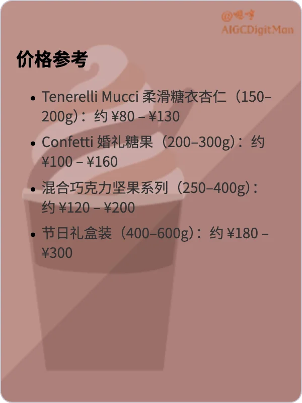 Tenerelli Mucci 柔滑糖衣杏仁(150–200g):约 ¥80 – ¥130