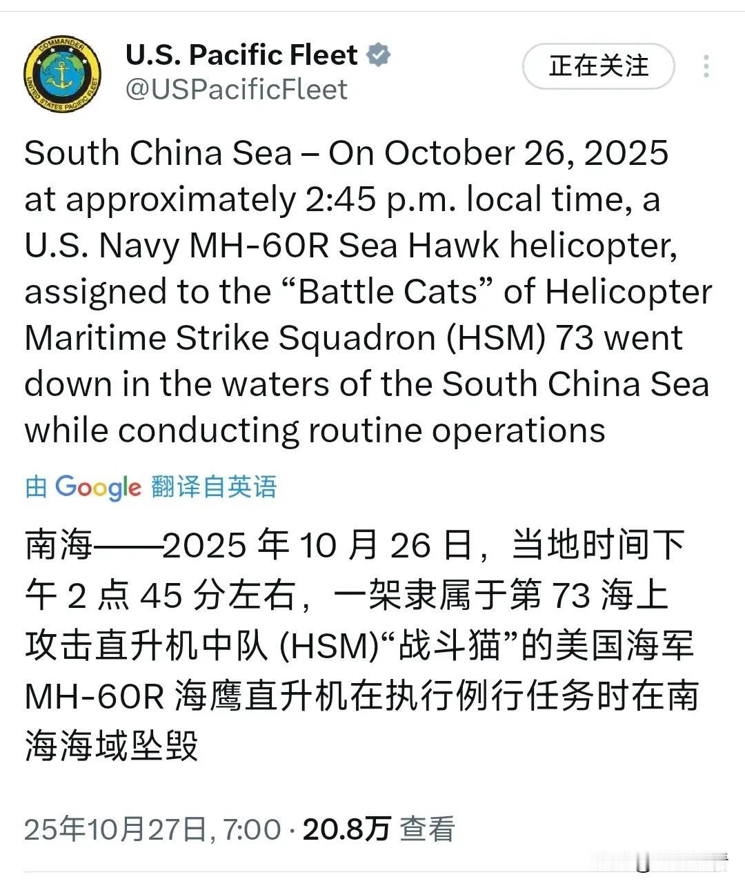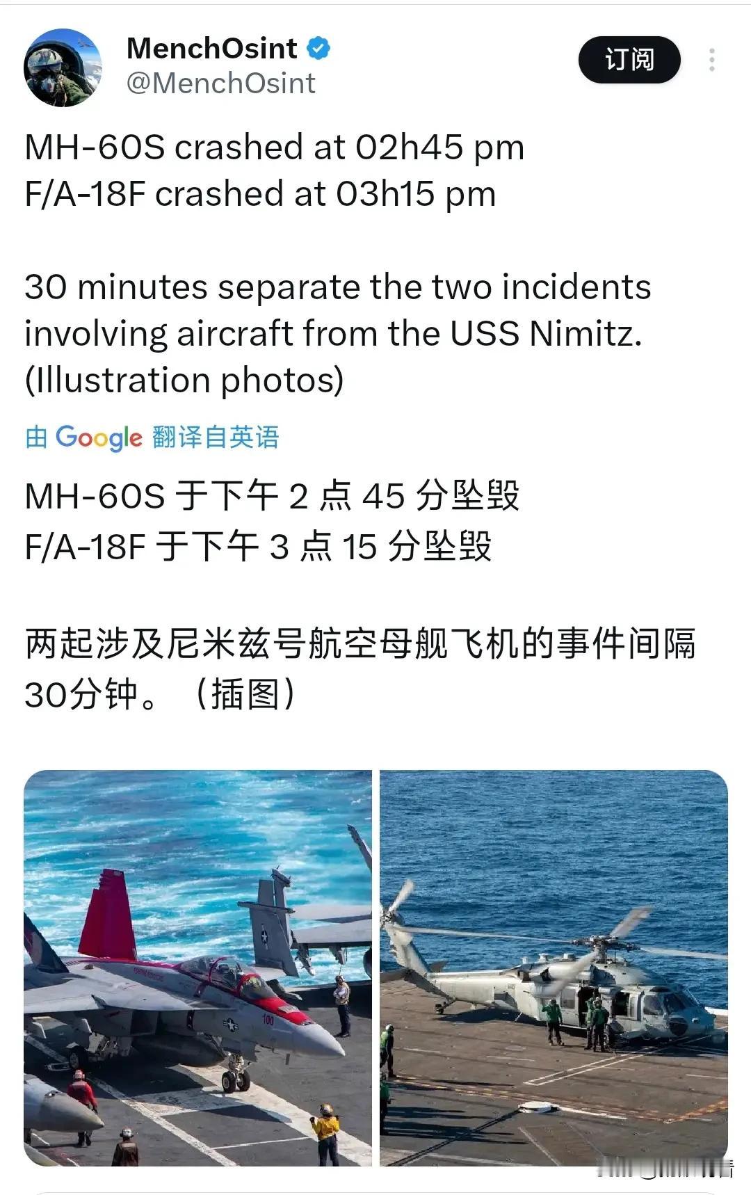 美军机半小时内连摔两架!南海刚出了个大新闻!美国海军两架军机从“尼米兹”号航母起飞后,居然在半小时内接连掉进海里,幸好机组人员都救上来了,这惊险程度堪比好莱坞大片! 但咱稍微琢磨下就觉得不对劲——俩不同类型的军机短时间内先后坠毁,哪有这么巧的事?网友都在猜原因:要么是航母的起飞设备出了故障,要么是当天南海的海况太特殊,也可能是机组操作失误,甚至有人怀疑是装备本身老化出了问题。毕竟美军军机这些年事故就没断过,高强度折腾设备,迟早要出问题。 说起来,美军最近在南海真的太“忙”了,今天抵近侦察,明天联合军演,恨不得把航母焊在这儿。这种高强度的军事活动,本身就把风险拉满了,出事其实是早晚的事。这波坠机估计得让他们好好掂量掂量,总这么“刷存在感”,到底值不值呢? 最关键的是,我觉得南海本来挺安稳的,美军天天来这里“秀肌肉”,不仅搅得地区局势紧张,还把自己置于危险中。这次是运气好救人及时,下次要是出更严重的意外,后果可就不堪设想了。 我只能说,如果想靠军事手段刷存在感根本行不通,安安稳稳搞对话协商才是正理。