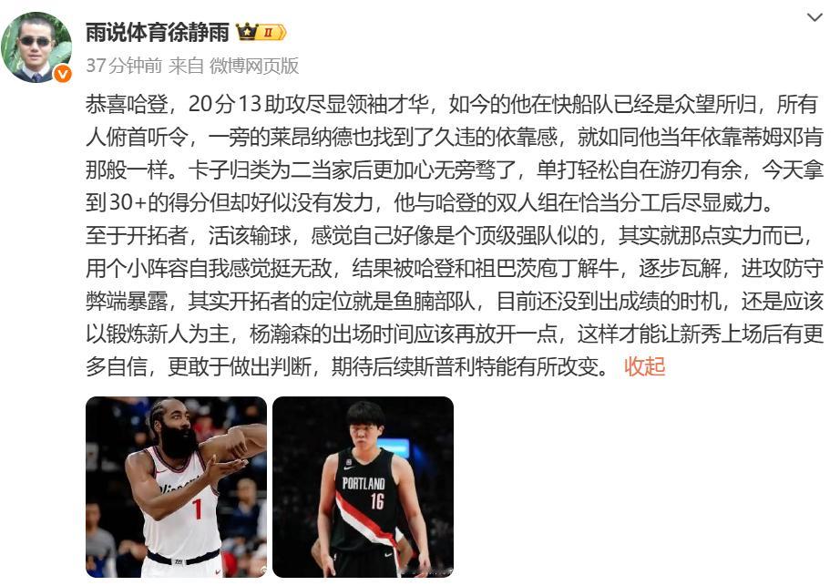 徐静雨:其实开拓者的定位就是鱼腩部队,目前还没到出成绩的时机,还是应该以锻炼新人为主,杨瀚森的出场时间应该再放开一点,这样才能让新秀上场后有更多自信,更敢于做出判断,期待后续斯普利特能有所改变。杨瀚森首个客场2分1板