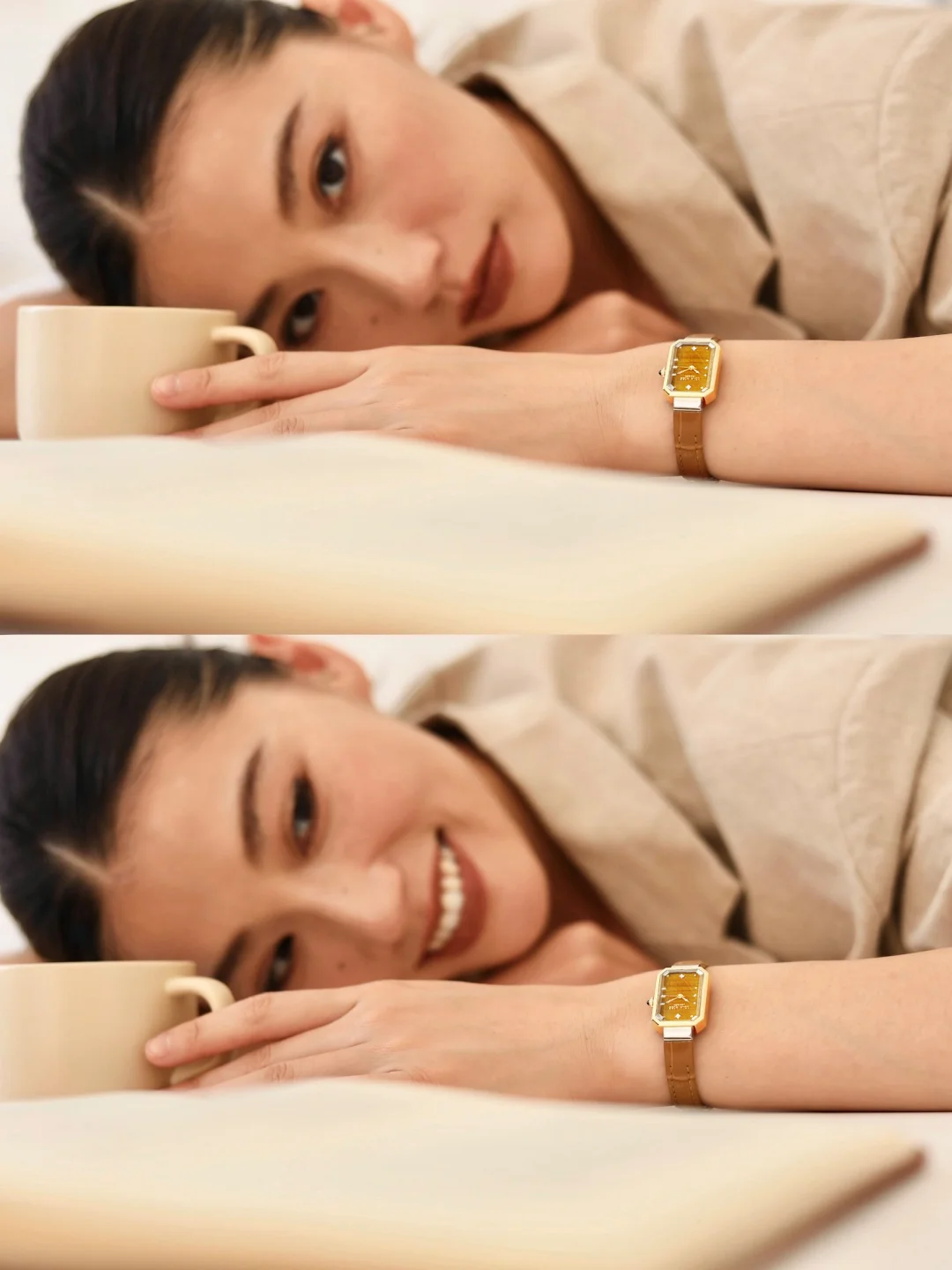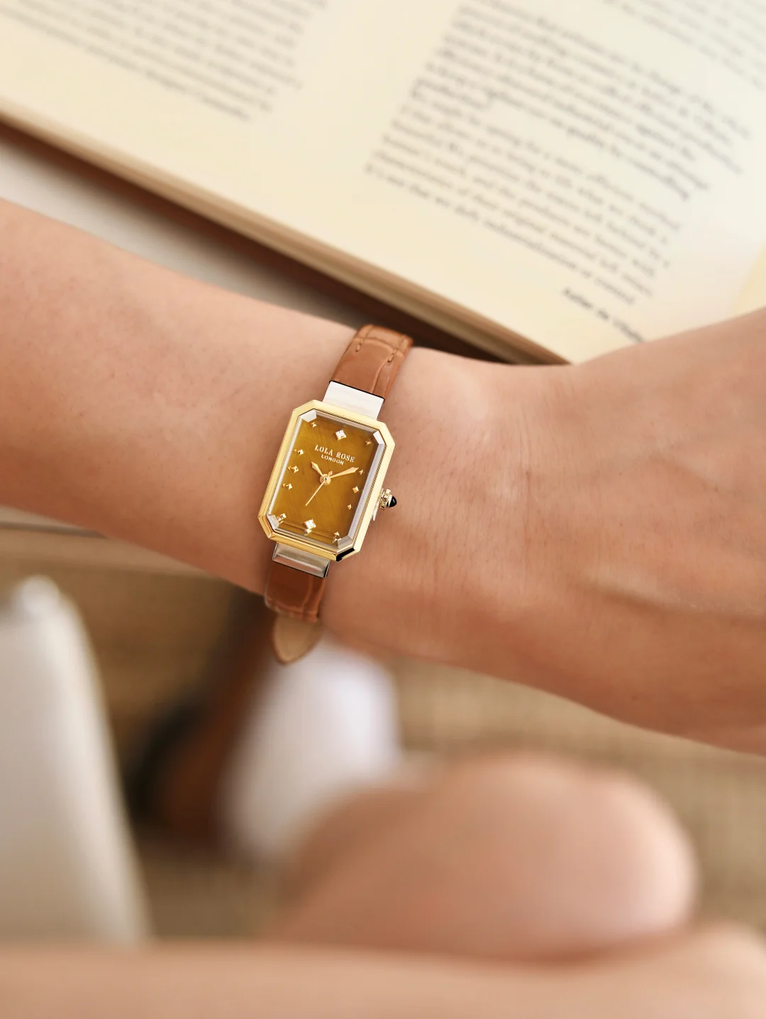 手腕上戴着 Lola Rose 方糖小棕表 皮带款,