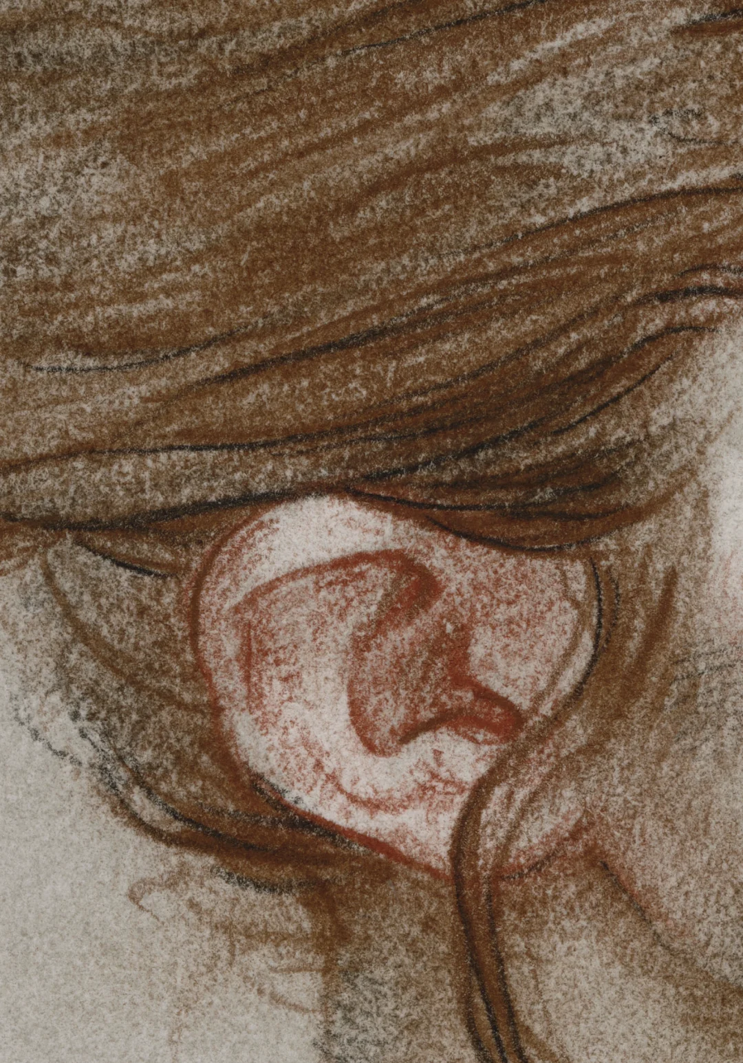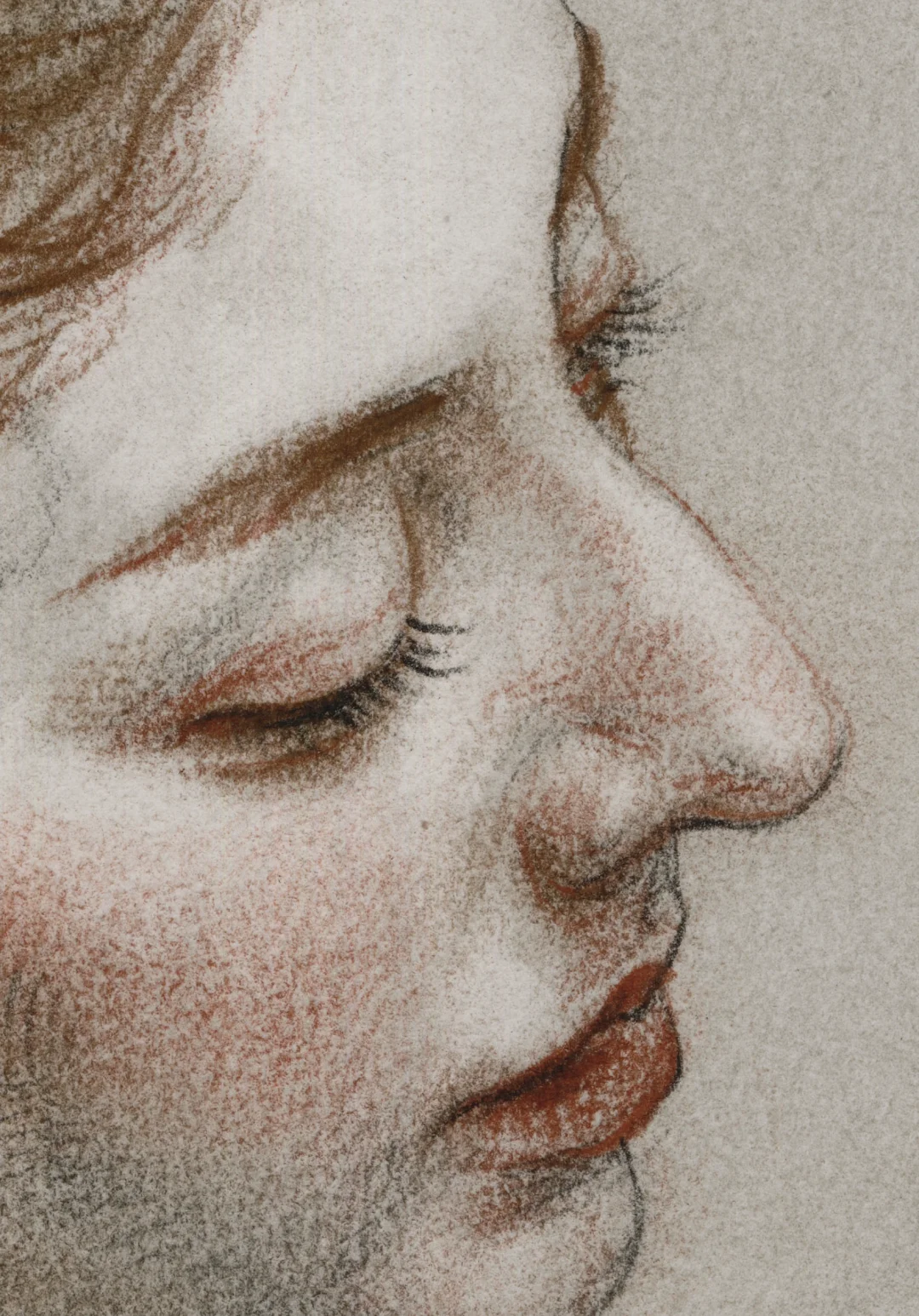 旅行外地我总是随身携带速写夹和素描画具。 从南京返回的高铁上, 根据博主“一棵茹”的美丽图片画成这幅素描。 她精致和谐的面孔让文艺复兴时代的古典神韵重现。 棕、土红、黑德国施笔乐(天鹅)粉彩笔 法国阿诗丽芙BFK纯棉手工版画纸 索斯自制有色底 橡皮提白 38X28CM(八开)