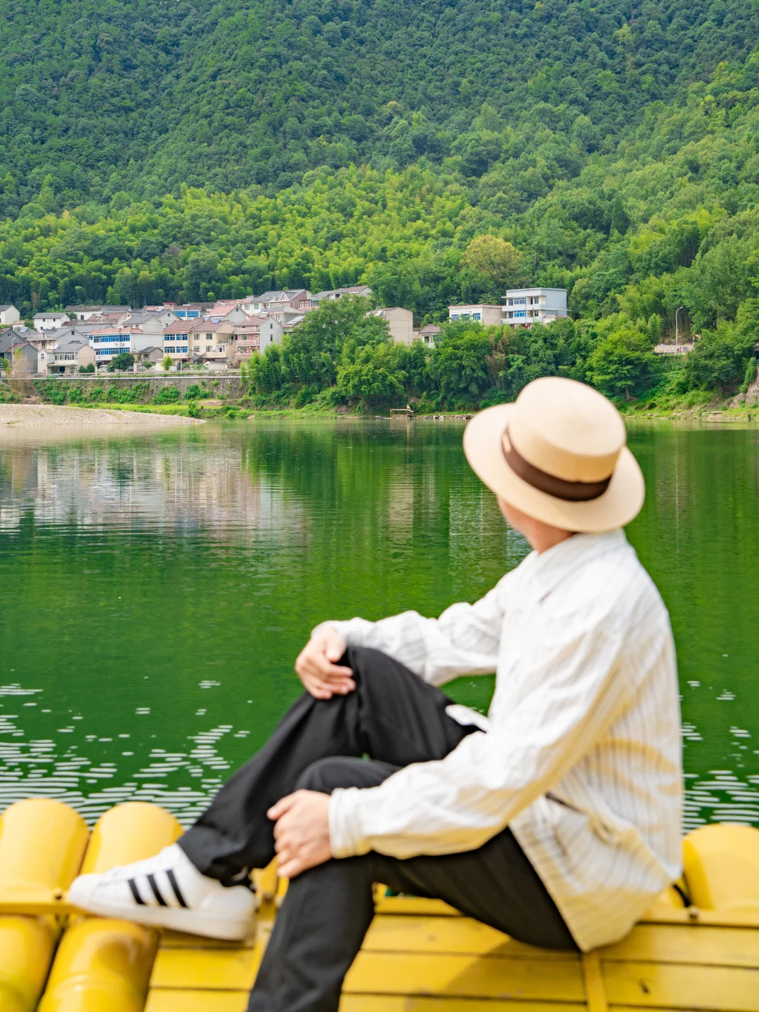 ✔️ 坐在筏边两脚泡水拍背影