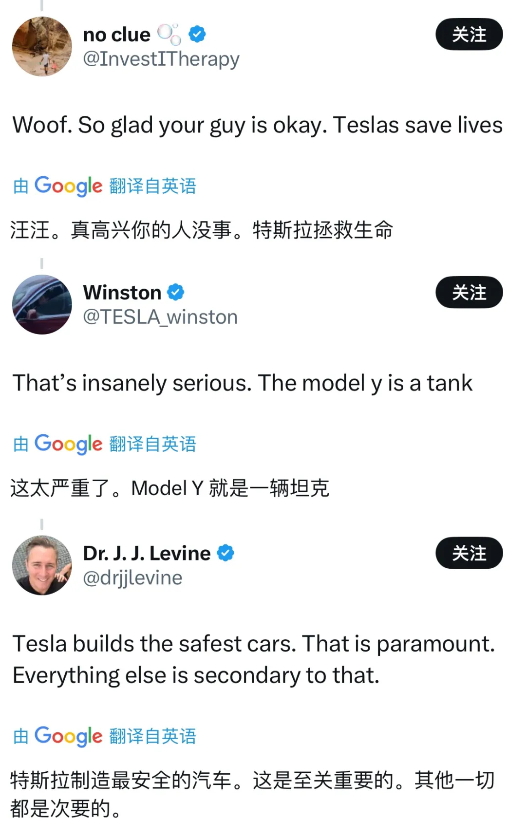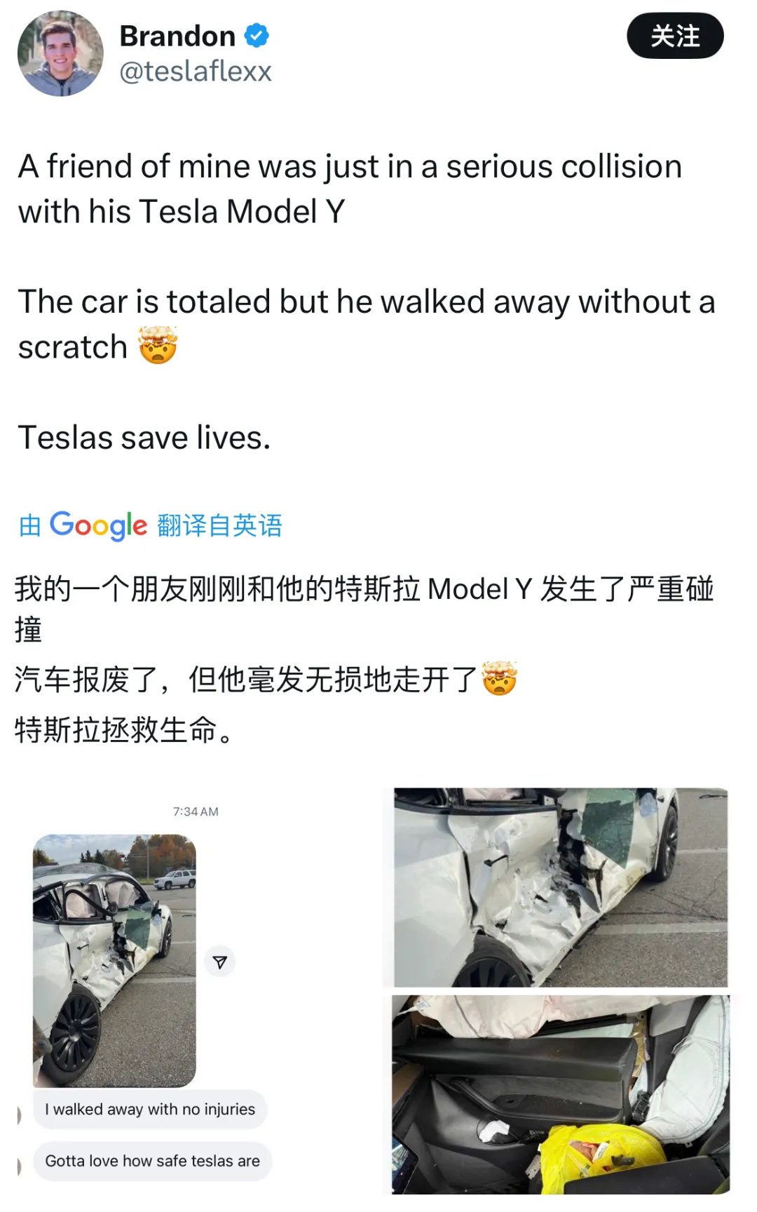 这是海外博主teslaflexx 在社交平台分享的一场惊险交通事故。连车主本人也频频感叹:“不得不佩服特斯拉的安全性!”