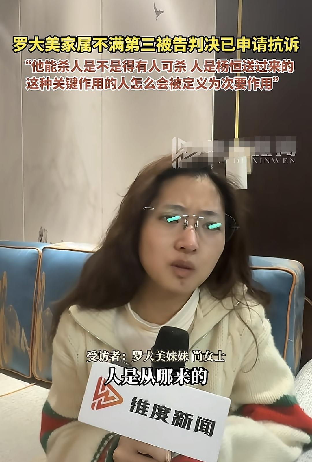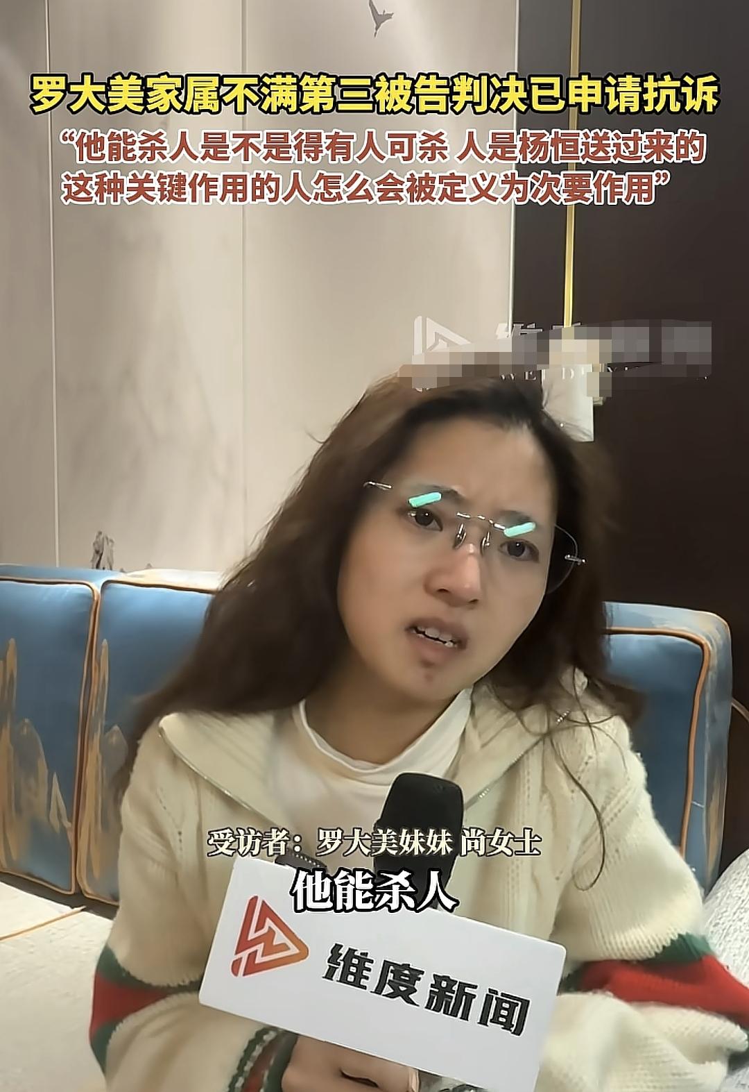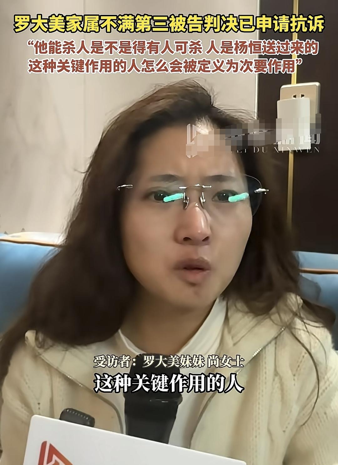 罗大美,你在天上看见了吗?你的妹妹真的好棒,距离为你伸张正义不远了! 妹妹逻辑能力是真强,短短几句话条理清晰,目标明确,不愧是有文化的人 她说“凶手杀人是不是得有目标?” “人是从哪里来的?” “人是杨恒送过来的” “这种关键作用的人,怎么会被定义为次要作用呢?” “对于从犯的判定是不严谨的” 妹妹的这几句话真的是很有力度,句句都说到了关键点,说白了,没有杨恒就不会有这个案子。余和沙也约不出罗大美,不应该是从犯,必定是主谋之一 800多天的等待,终于看到了坏人被绳之以法,可这力度还不够,杨恒的13年太短,就连大美父亲都说“唉,判的太轻了” 现在全国都在支持大美家人申请抗诉,像杨恒这种居心不良的人,要是仅仅13年就出来了,日后还是会成为祸害! 还有3天法院就会有回应,我们一起等待抗诉结果吧!