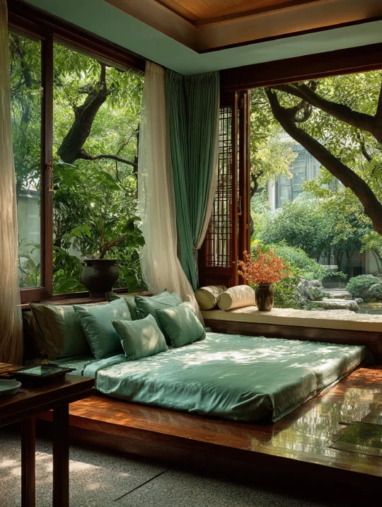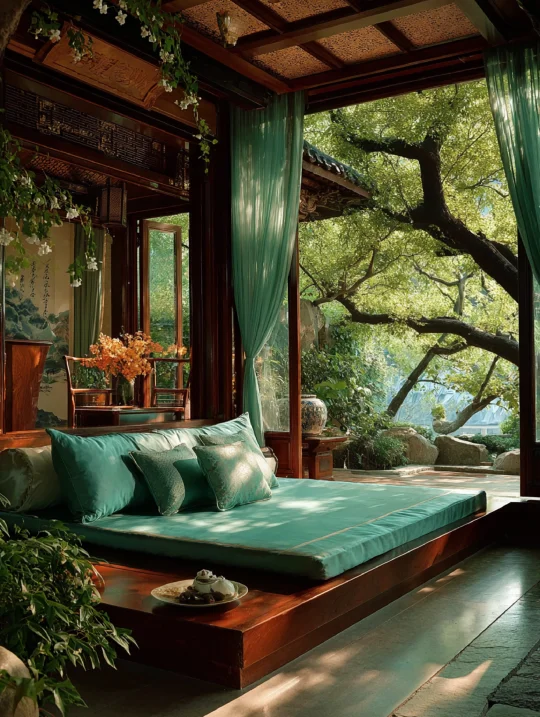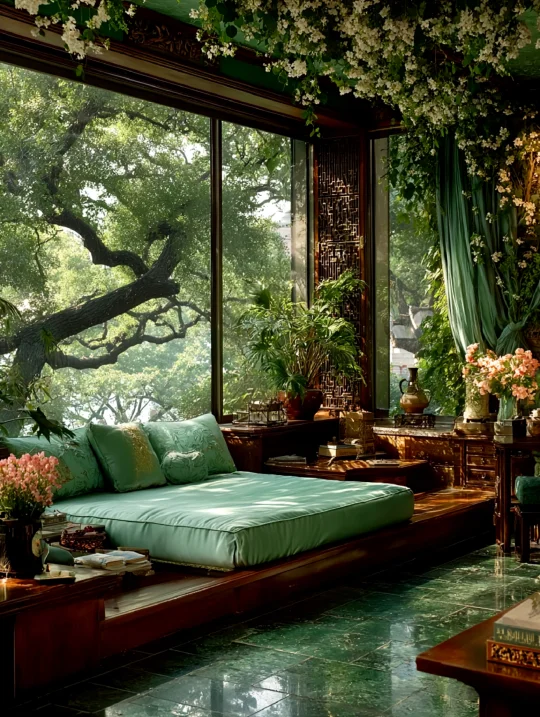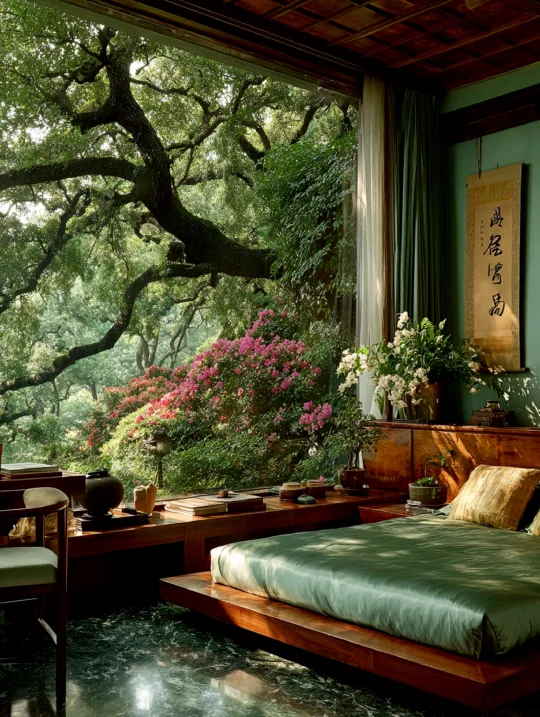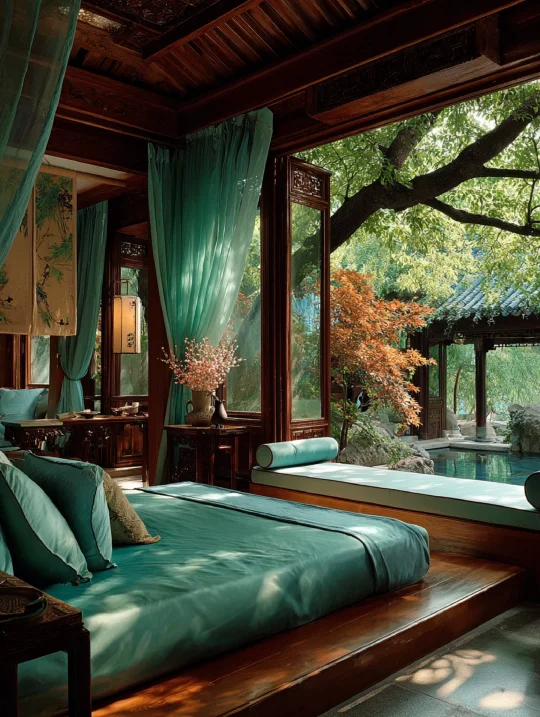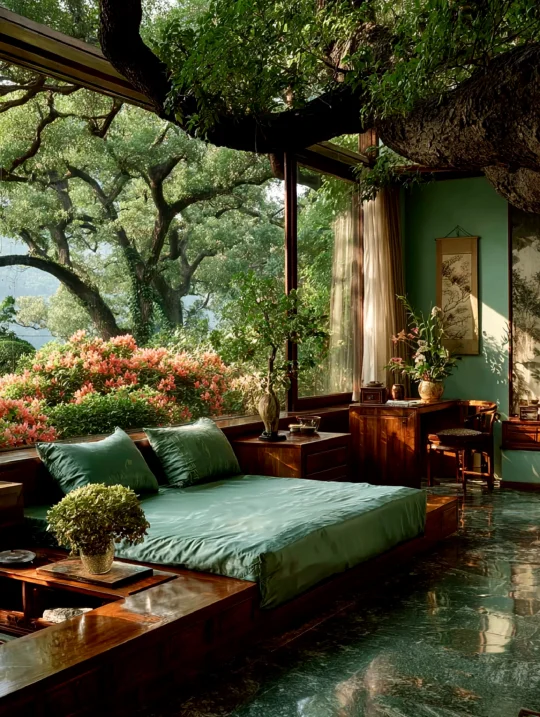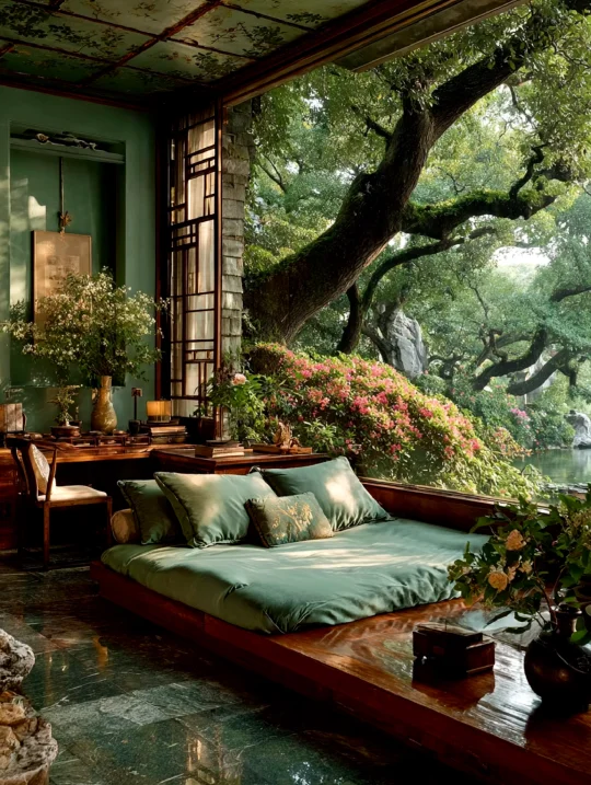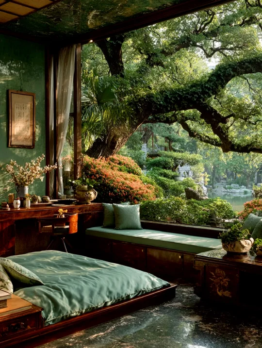 🪑【东方骨相×现代肌理】 看到窗外的那一刻 我仿佛跌进了水墨画里的私家园林 原来睡在风景里,真的会做神仙梦💤 图片里有bug的地方,因为总体很美好就没改图,被你们发现了没~ 【作品为ai辅助创作】