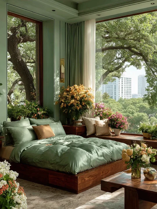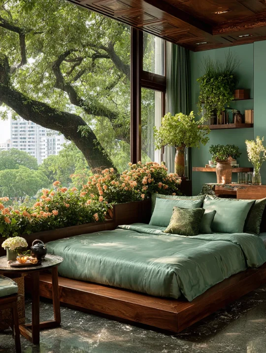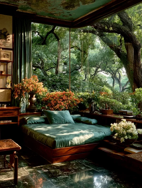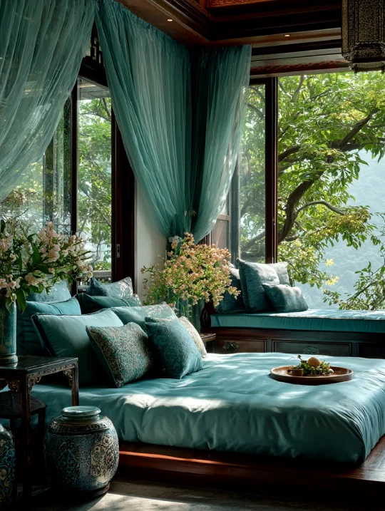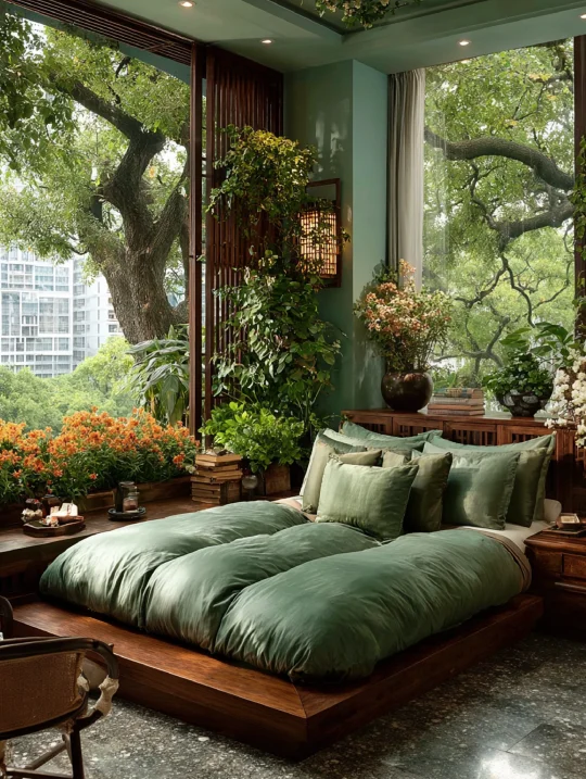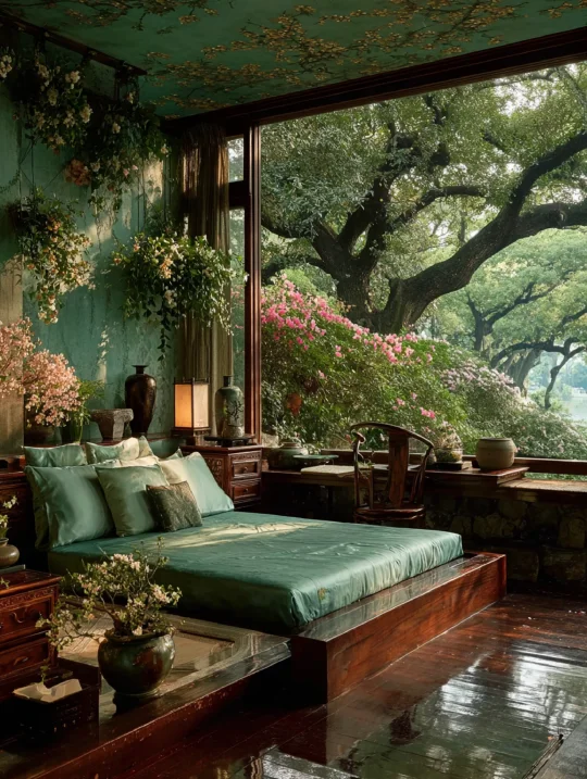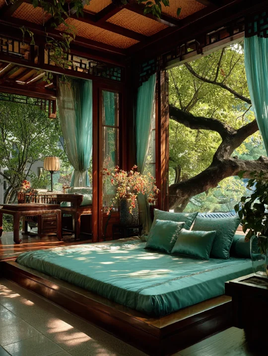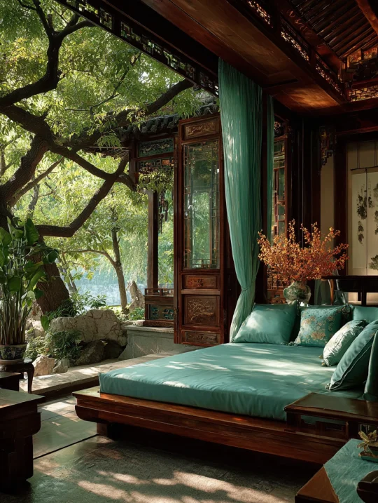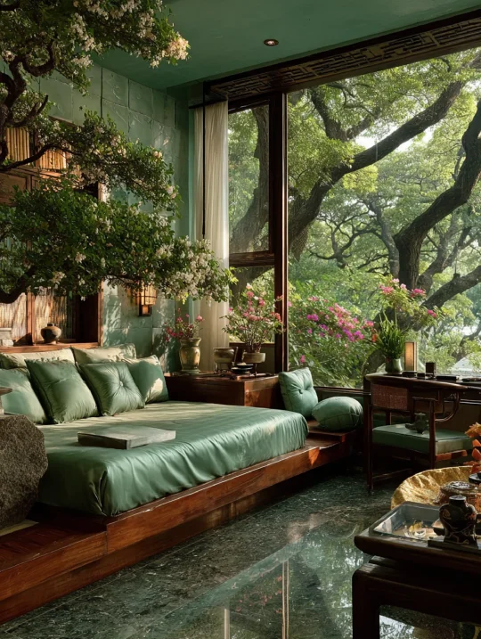 🪑【东方骨相×现代肌理】 看到窗外的那一刻 我仿佛跌进了水墨画里的私家园林 原来睡在风景里,真的会做神仙梦💤 图片里有bug的地方,因为总体很美好就没改图,被你们发现了没~ 【作品为ai辅助创作】