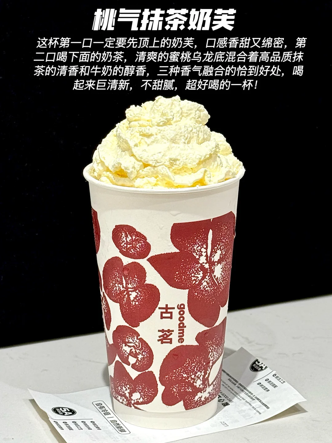 这杯第一口一定要先顶上的奶芙,口感香甜又绵密,第二口喝下面的奶茶,清爽的蜜桃乌龙底混合着高品质抹茶的清香和牛奶的醇香,三种香气融合的恰到好处,喝起来巨清新,不甜腻,超好喝的一杯!