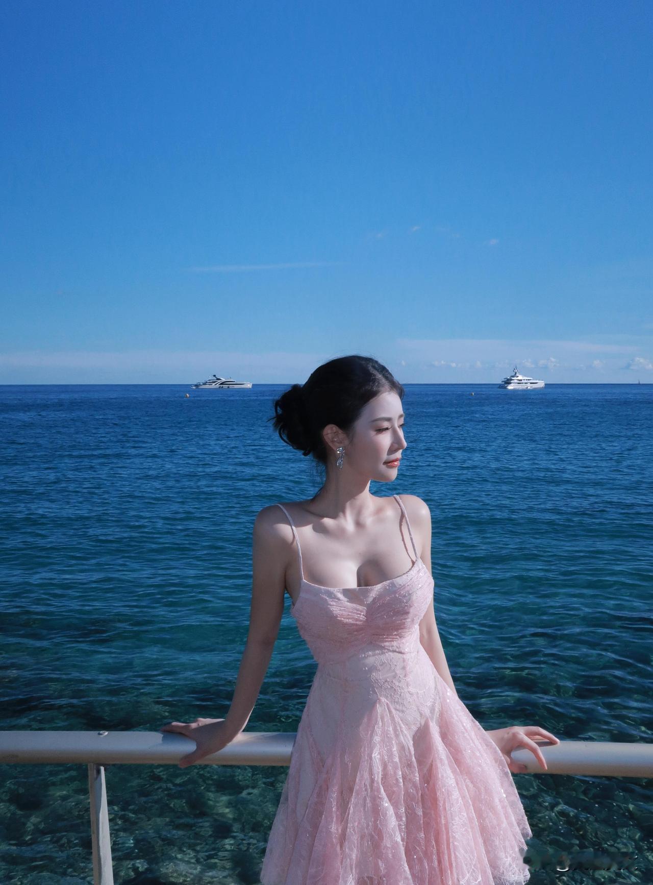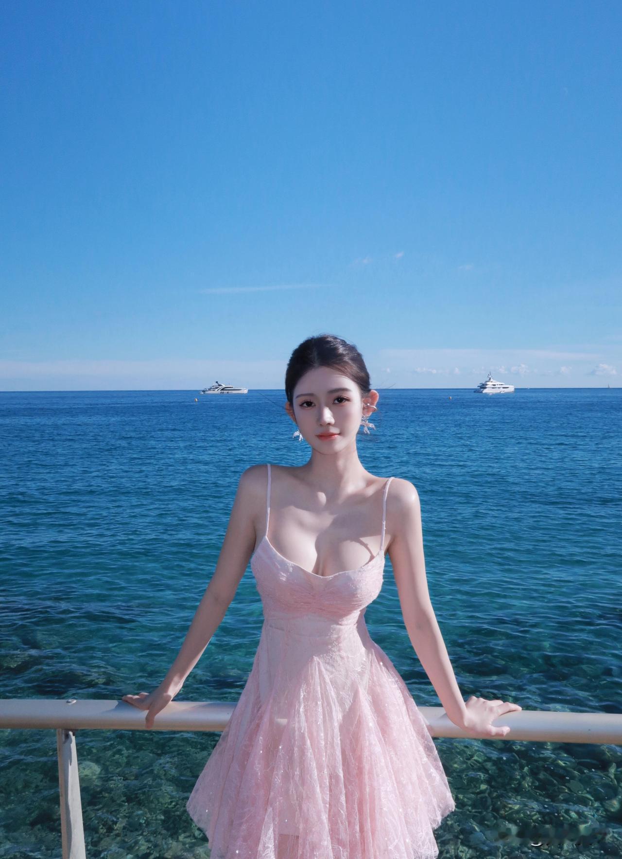 海边度假风,粉色裙摆飘逸,海天一色,美不胜收!
