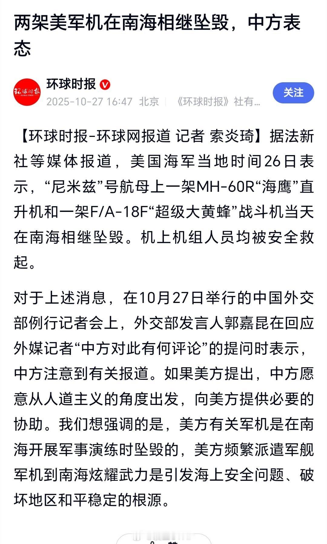 中方回应美军机南海坠毁如果美方提出,中方愿意从人道主义的角度出发,向美方提供必要