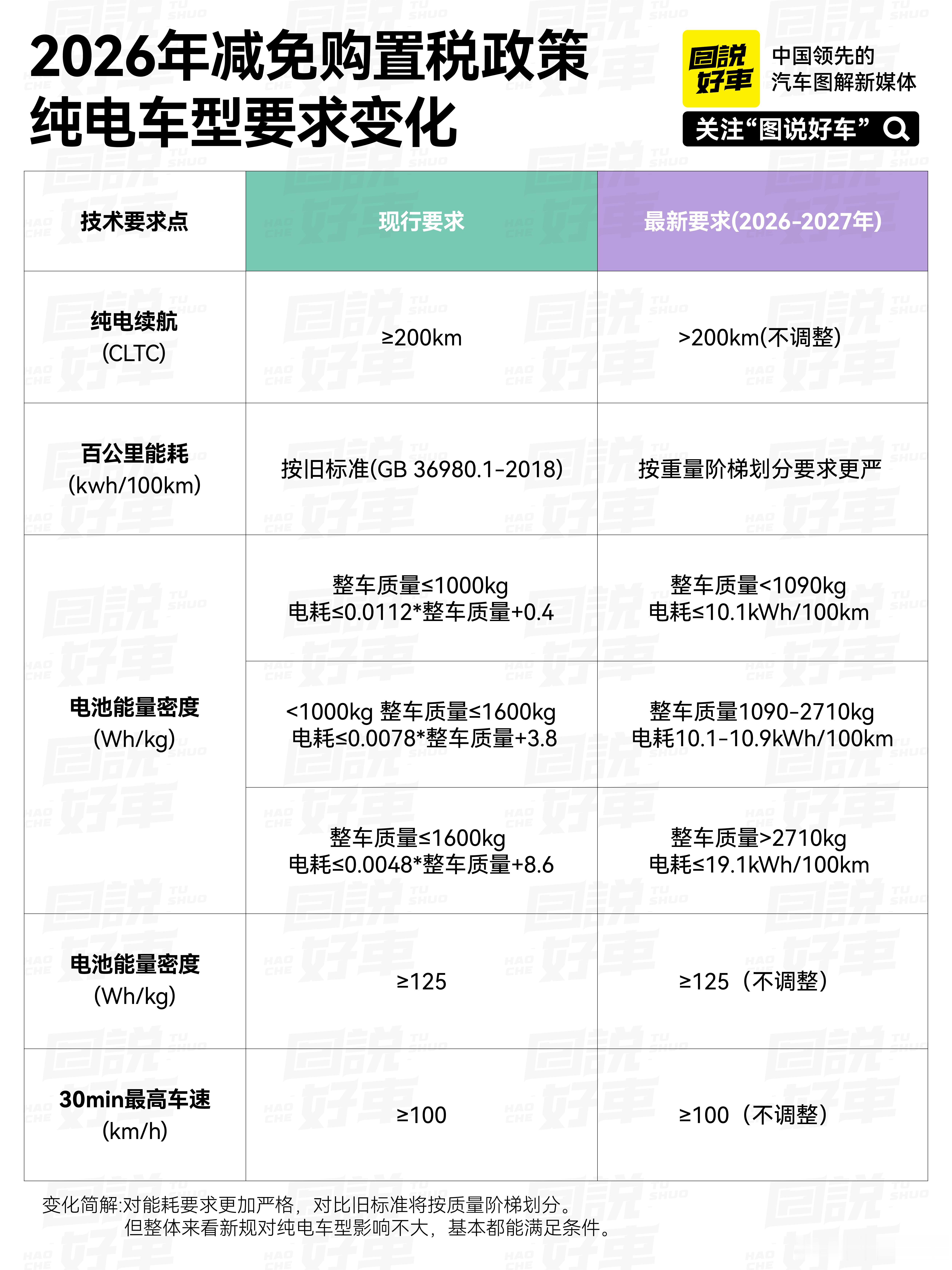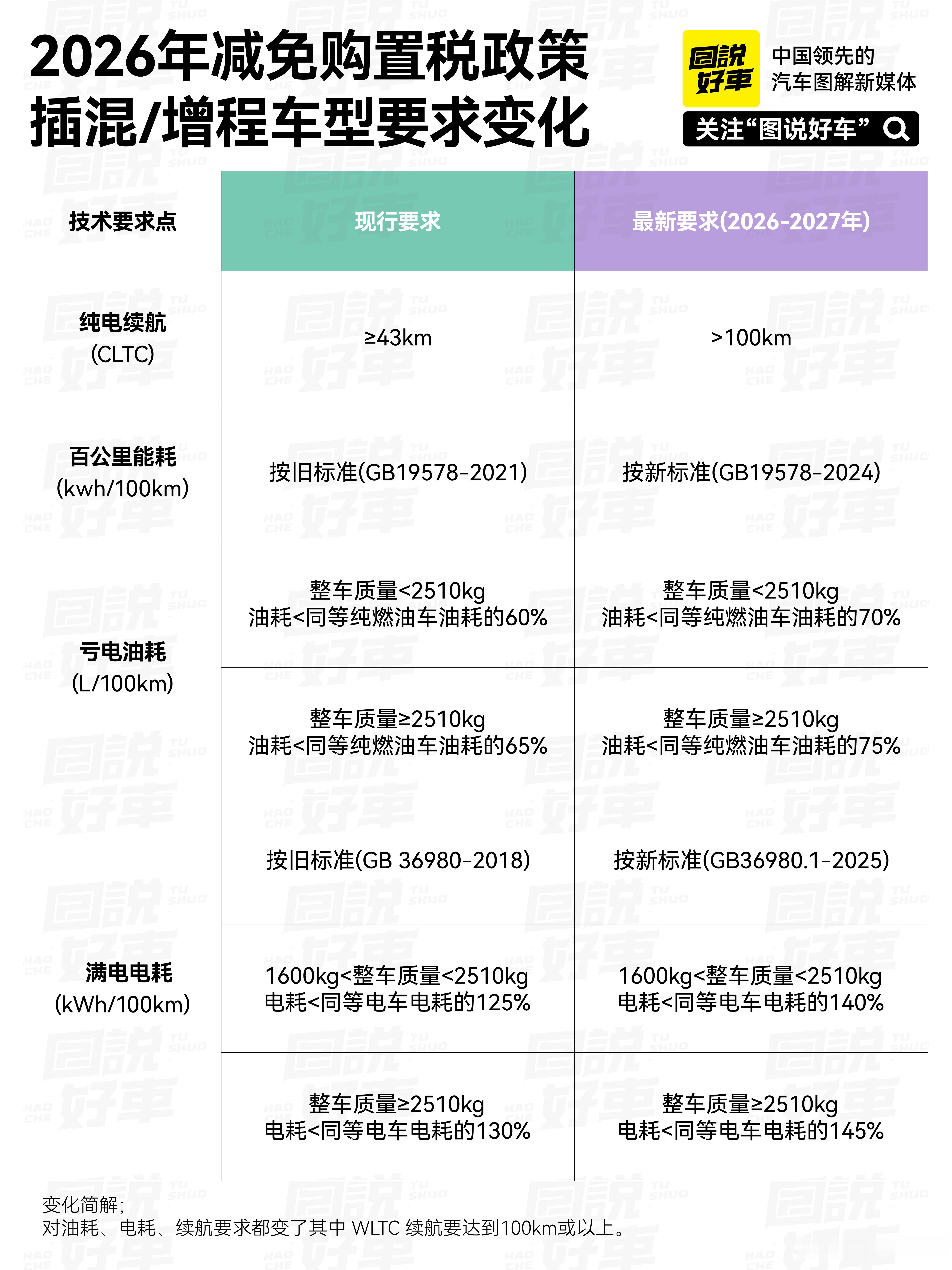 前段时间,国家工信部等三部门调整了 2026-2027 年对于减免购置税的新能源汽车产品技术要求,对于纯电以及插混等车型均作了不同的要求细节。