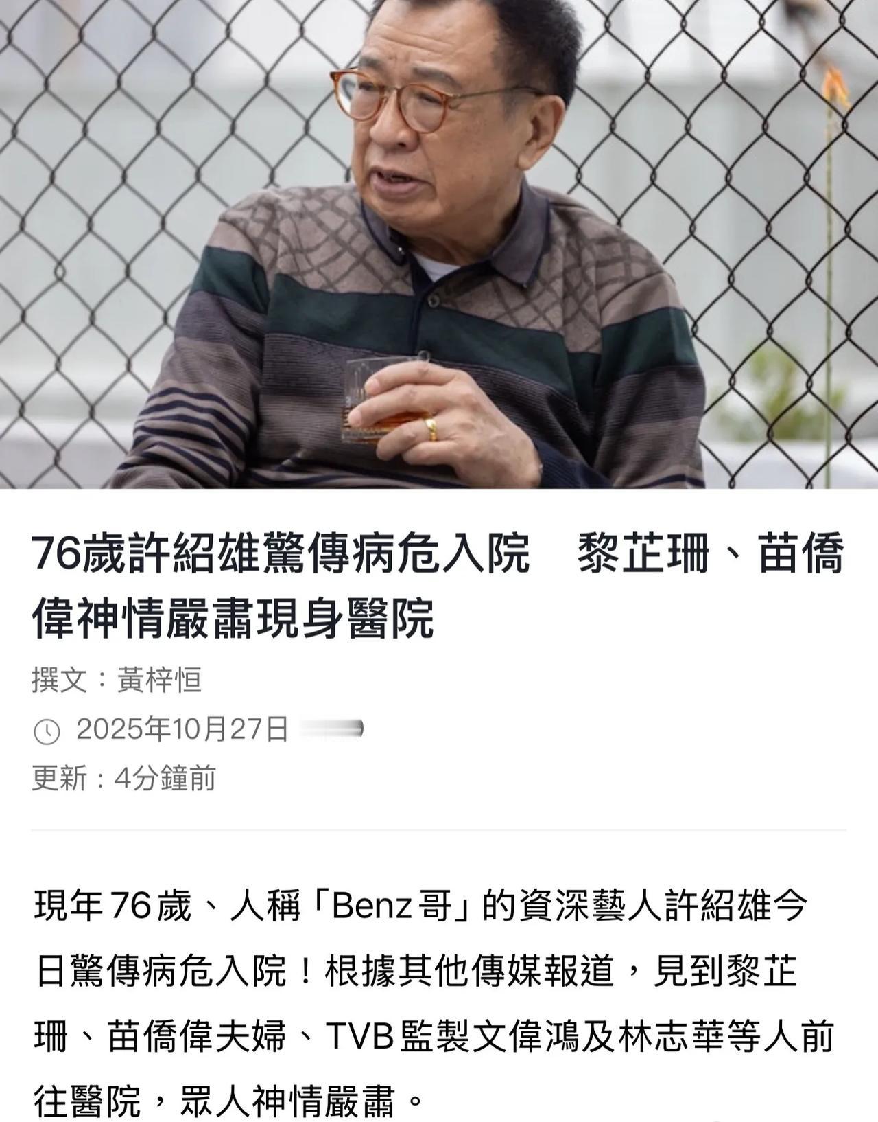 曝许绍雄病危入院,黄子华欧阳震华等多位艺人前往探望。 据港媒,76岁的“Benz 哥”许绍雄被曝病危入院,欧阳震华、黄子华、黎芷珊、苗侨伟戚美珍夫妇、TVB监制文伟鸿及林志华等现身医院探望,众人神情严肃,不知具体情况如何。 佘诗曼今天在澳门出席活动时,被问干爹许绍雄入院,佘诗曼忍不住爆哭,她说自己早知道对方身体出状况,也一直在处理这些事情,自己也有去探望对方,不过现在不方便透露发生了什么事,要等对方家人说。 佘诗曼还提到两人在去年底拍摄《正义女神》时,许绍雄的身体和精神状况,说:“(那时候)OK,他还有很多对白,都背得完,(记者:好精神?)是的。” 至于许绍雄身体何时出现不适,佘诗曼再次表示要留待对方家人说。而佘诗曼透露本来自己是要去北京宣传的,但现在会先回香港探望对方。 前不久才刚刚看完老爷子和张家辉演的《绝命法官》,一直感叹还得是TVB老演员们!希望老爷子平安健康,继续在屏幕里刷脸,港剧没你们不行啊!