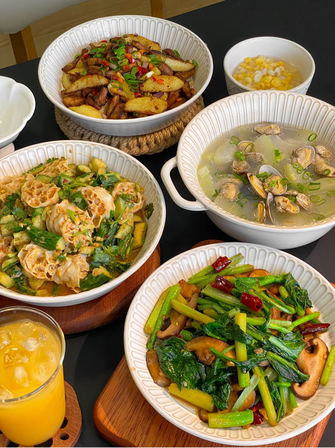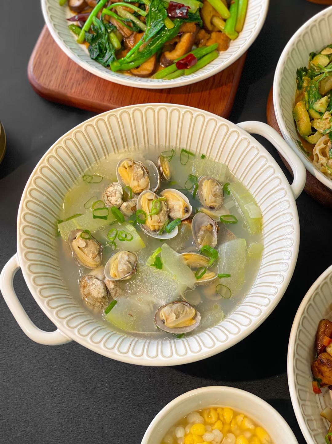 今日菜单🥣: 1️⃣椒盐猪颈肉 2️⃣冬瓜蛤蜊汤 3️⃣香菇炒菜心 4️⃣黄瓜拌面藕