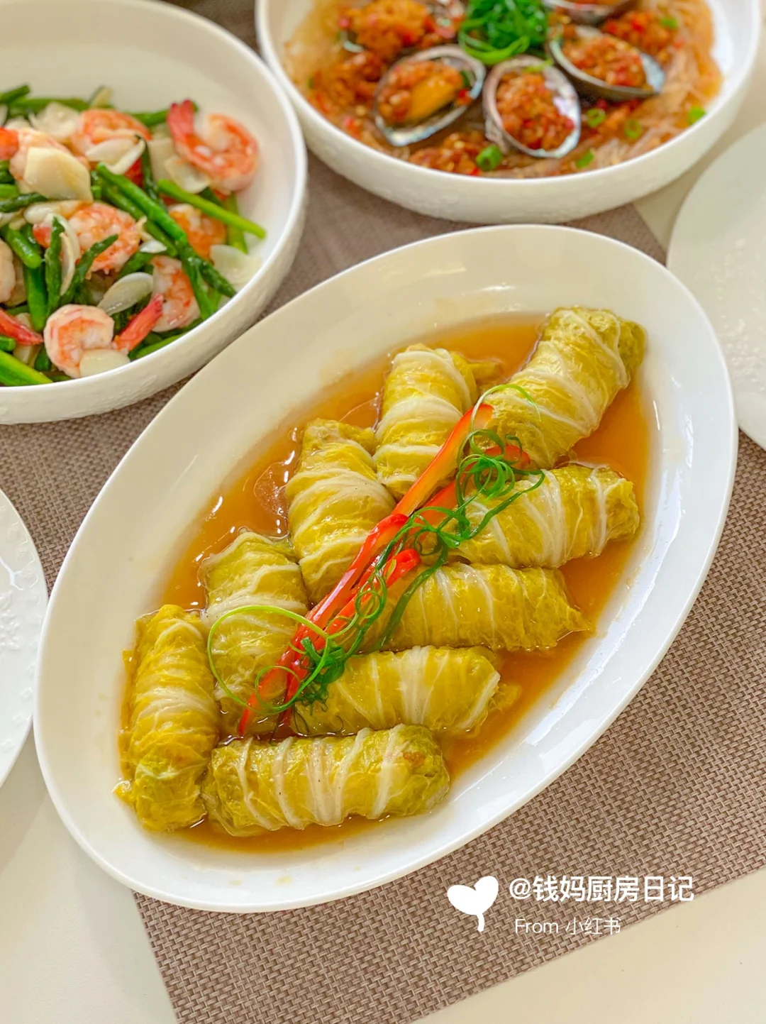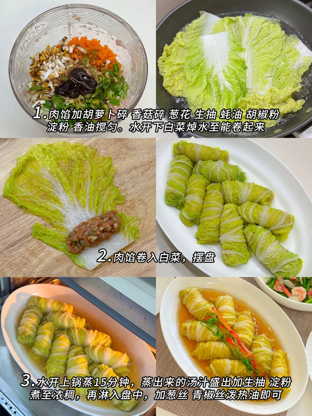 最近发现的宝藏菜,小宝宝也能吃。白菜裹上鲜美的肉馅,蒸15分钟,蒸出来的汤汁加淀粉生抽煮浓稠再淋入盘中,放葱丝 红柿子椒丝,泼热油即发香味即可。每一口咬下去,都是满满的肉香与白菜的清甜, 不仅美味,还寓意着新一年满满的财富和幸福!