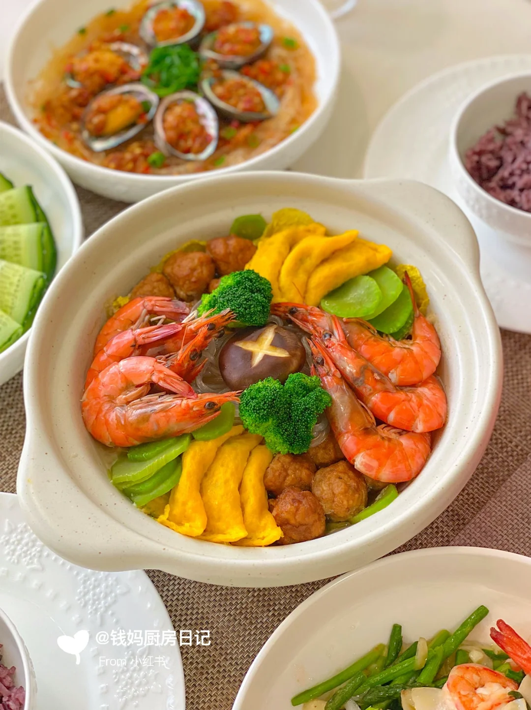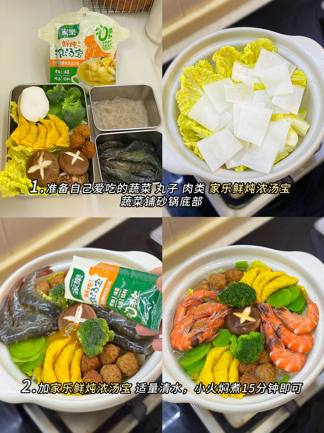 北方过年,那必须得有砂锅全家福!这道菜一上桌,年味直接拉满,把喜欢的蔬菜铺入砂锅底部,加上爱吃的丸子、肉类 ,再倒入家乐鲜炖浓汤宝、适量清水,瞬间5秒还原8小时慢熬的鲜炖高汤!让营养无味的食材变得更好吃小火焖煮15分钟,就完成啦。这汤底鲜得嘞,浓得嘞,各种食材都被衬得超美味,白菜、丸子吸饱了鲜美的汤汁,每一口都超满足!