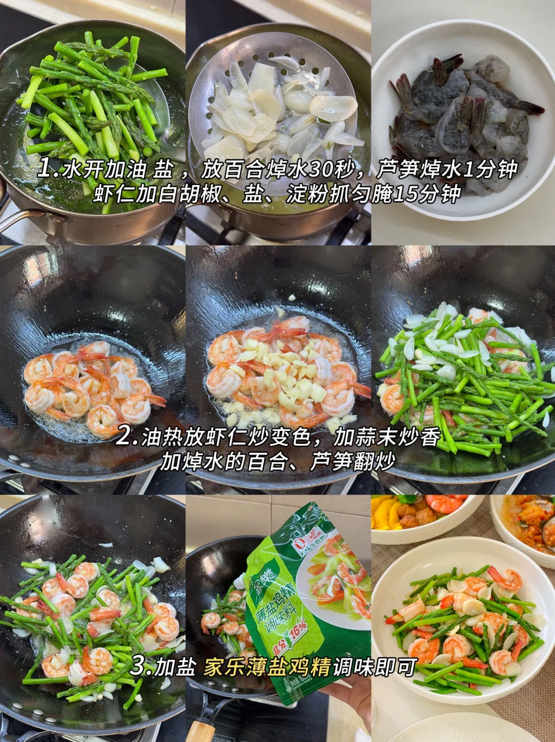 鲜灵灵的超亮眼,芦笋脆嫩,百合清甜,虾仁弹滑,大小朋友都喜欢。芦笋削去底部的老皮,切段焯水,百合也焯水,虾仁加少许盐、白胡椒粉、淀粉抓匀腌制15分钟,油热下锅炒至变色,加蒜末炒香,放芦笋百合翻炒,加盐、家乐薄盐鸡精调味就可以啦。这个薄盐鸡精盐分低,但是盐分下降鲜味不减,醇正鸡鲜味含50%以上肉质及鲜美原料,醇正鸡鲜味让食材的味道更鲜美。还没有防腐剂和反式脂肪,全家放心吃。
