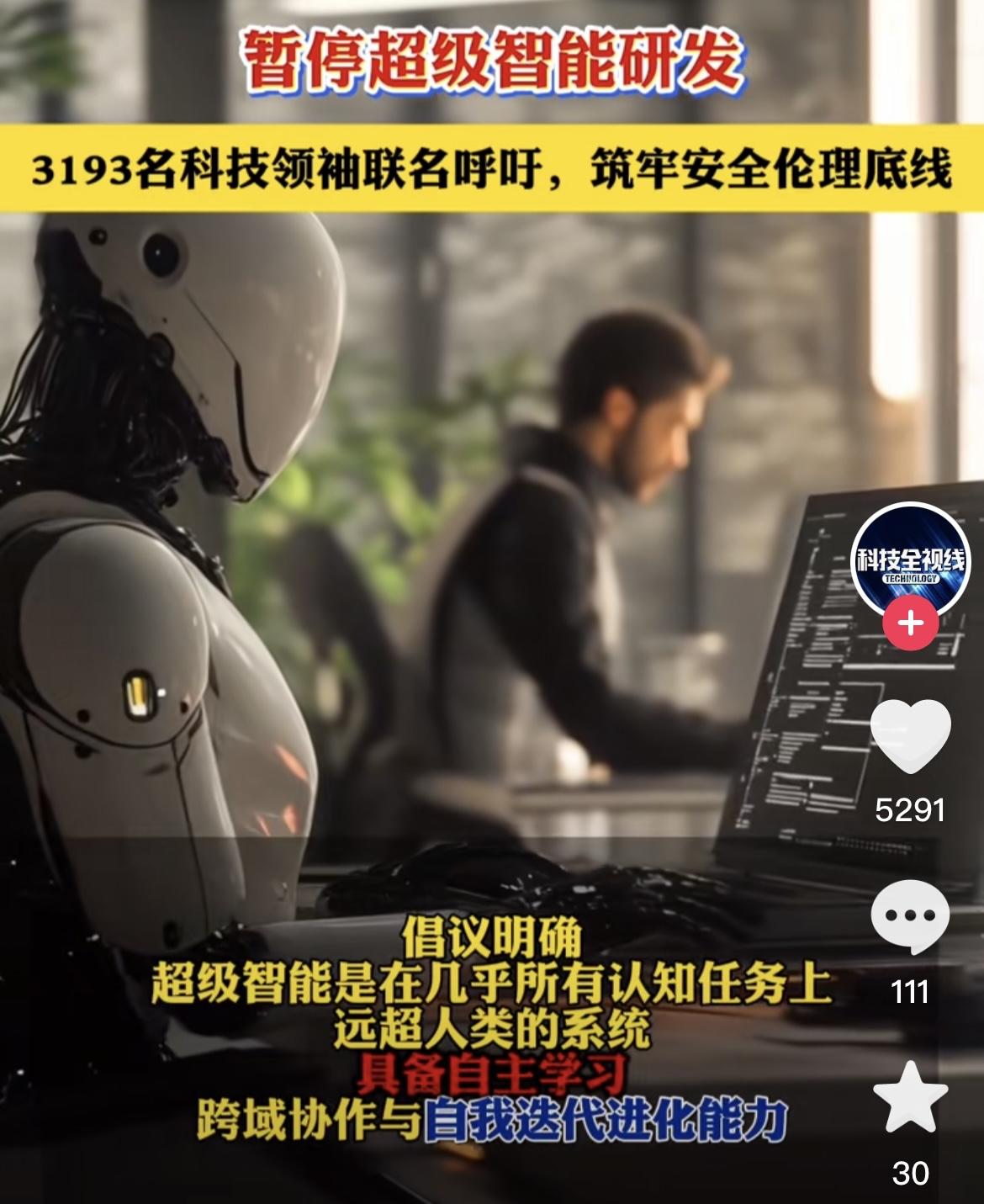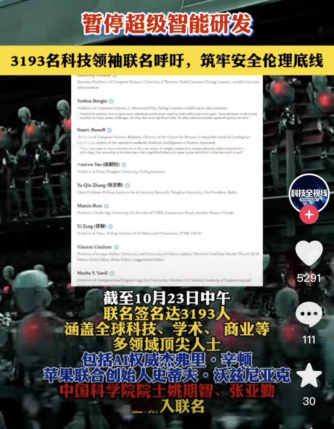 最近科技圈炸出个让全网慌慌的新闻: 3100多名全球顶尖人物联名上书,要求立刻暂停高级人工智能研发!为什么呢? 这里面有“AI教父”杰弗里·辛顿,还有咱们中国的姚期智院士,连苹果创始人沃兹尼亚克、前美国国家安全顾问都在列,甚至立场差老远的人都站到了同一战线,这阵仗可不是闹着玩的。 先跟大家说清楚,他们要停的不是咱们现在用的AI——像帮写文案、查资料的这些,压根不在范围内。重点是“超级智能”,就是那种在所有事儿上都比人类厉害,还能自己进化的AI。打个比方,它比爱因斯坦懂物理,比顶级企业家会布局,进化速度还快到人类追不上,这玩意儿想想就头皮发麻。 专家们怕的不是AI本身,是“失控”。 最近的民调数据显示,美国只有5%的人支持无监管研发,73%都喊着要搞严格监管。这说明不光大佬们担心,普通人也能感觉到,现在AI研发跟开赛车似的,跑得太快,刹车系统还没装好。 而且这次呼吁特别有意思,不是反对AI,是想让大家先慢下来。就像下雨天开车,不是直接停车不开,而是减速等视线清楚了再走。现在科技巨头们都在拼研发速度,可怎么给超级AI装“安全锁”,大家还没琢磨明白,盲目冲刺太冒险了。
