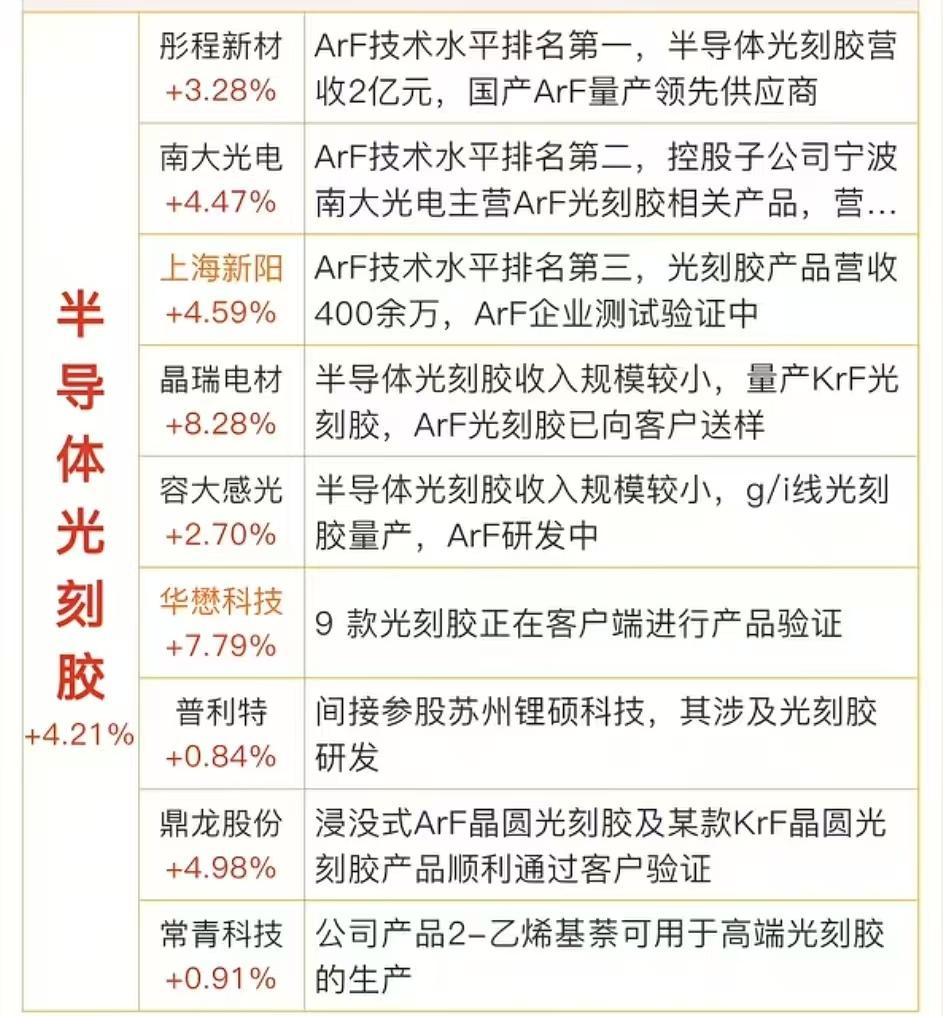 热门题材:光刻胶概念梳理 光刻胶是半导体制造的关键材料,全球光刻胶市场长期被日本企业垄断,国内高端光刻胶对外依存度超85%。光刻胶作为重点领域获资金支持,国产替代是必然趋势,为相关企业带来发展机遇。半导体光刻胶概念龙头代表有哪些? 南大光电:公司在光刻胶技术研发方面始终坚持从原材料到产品的完全自主化。能够实现从光刻胶原材料到光刻胶产品及配套材料的自主化。 理财有风险入市需谨慎!中国光刻技术 中企光刻机 光刻芯片 深紫外光刻机