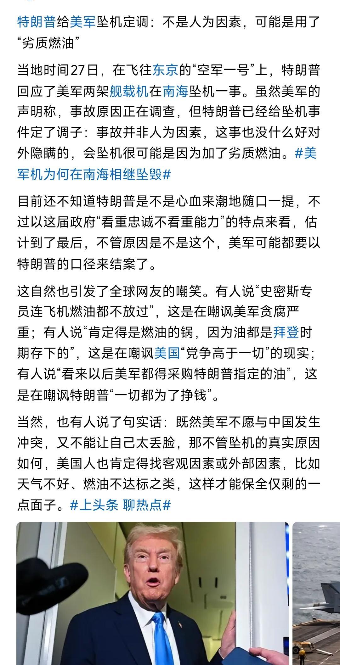 不用猜了!特朗普说了,美军掉南海俩飞机,是用了劣质燃油! 怎么说呢?和本子中将喂鱼一个道理 当你强大时,打下他的飞机,他说是自己问题,不关你的事 当你弱小时,他就算自己失误一坠毁,也要发动战争,割地索要赔偿 #秋日生活打卡季#