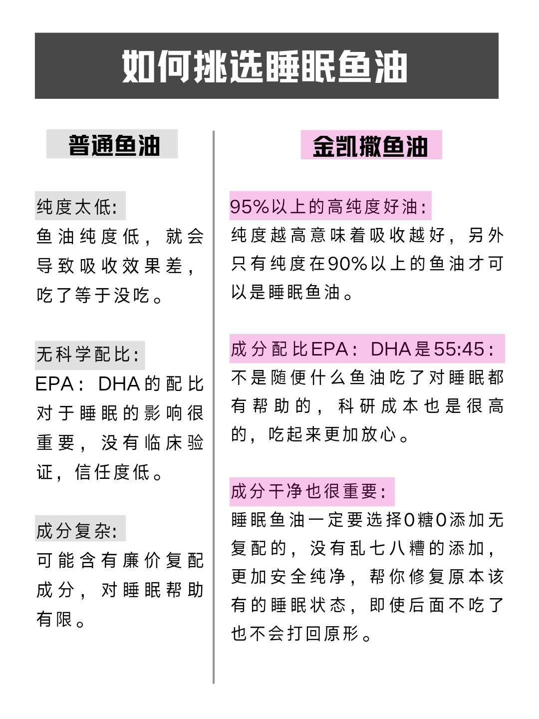 [星R]那么大家在选择鱼油时要记得要选择90%以上的鱼油,纯度越高意味着吸收越好,对于睡眠的影响也越大。推荐一下我自己也在吃的金凯撒鱼油,盒子明明白白标着95%,我这批查了竟然有97%,是真正的高纯度睡眠好油。而且这个鱼油也没啥乱七八糟的添加,更加安全纯净,帮你修复原本该有的睡眠状态,即使后面不吃了也不会打回原形。