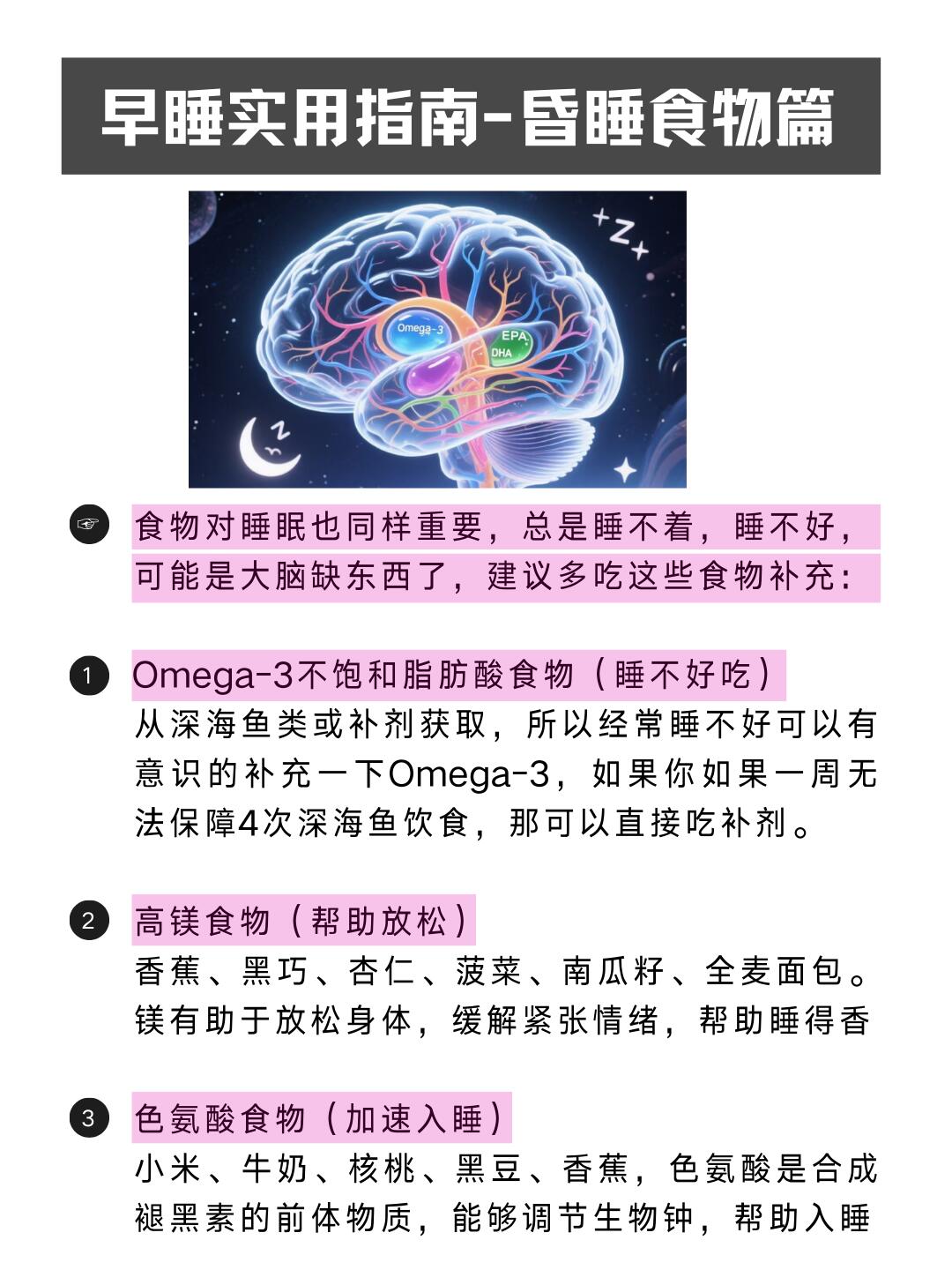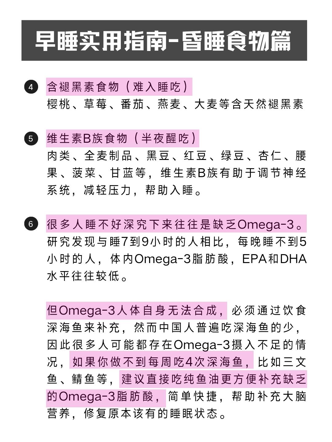 另外食物对睡眠也同样重要,总是睡不着,睡不好,可能是大脑缺东西了,尤其是Omega-3脂肪酸(EPA和DHA),但Omega-3人体自身无法合成,必须通过饮食深海鱼来补充,然而中国人普遍吃深海鱼的少,因此很多人可能都存在Omega-3摄入不足的情况,也就说,如果你经常睡不好,深究下来大概率是缺乏Omega-3了。