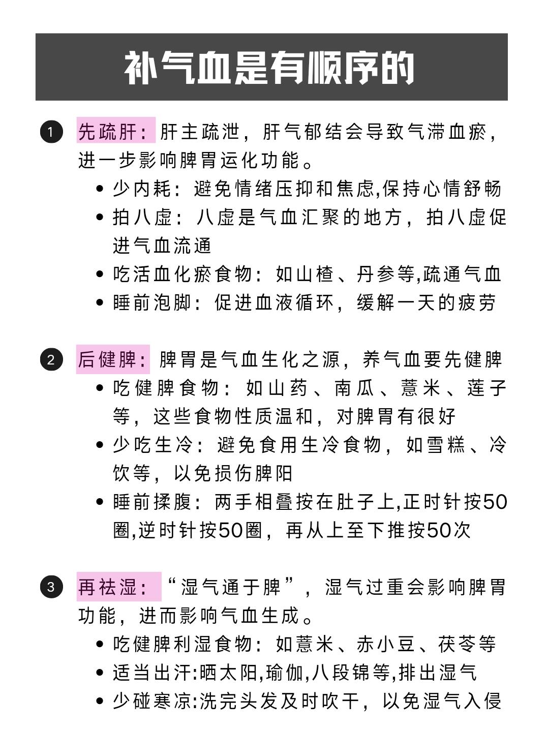 [勾引R]而且养气血是有正确顺序的,顺序不对等于白补,先疏肝,后健脾,再祛湿,前3步完成,气血通畅,脾胃功能正常,补气血效果才好。
