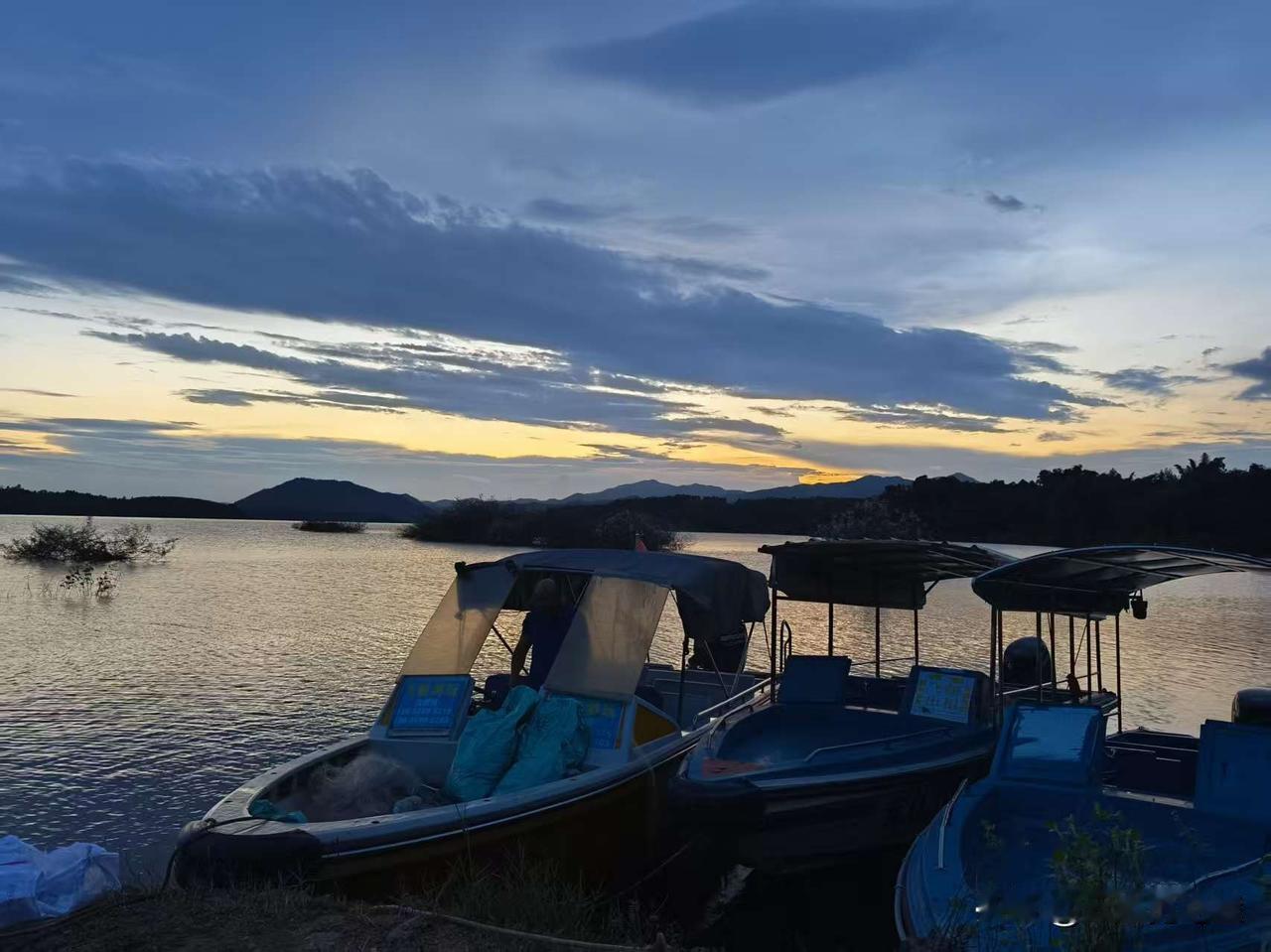 刚蹲在湖边看船,风裹着水汽往脸上扑,凉丝丝的。这几艘船看着旧,棚子边还挂着点没收的网,像刚歇工的老伙计。 天快暗透了,远处山尖还沾着点橙黄的光,云堆得像揉皱的蓝布,把那点光滤得软乎乎的。水面晃着碎金,晃得我眼睛发沉——好像下一秒就能听见船老大喊“收工喽”,然后桨声吱呀着划开一湖的暮色。