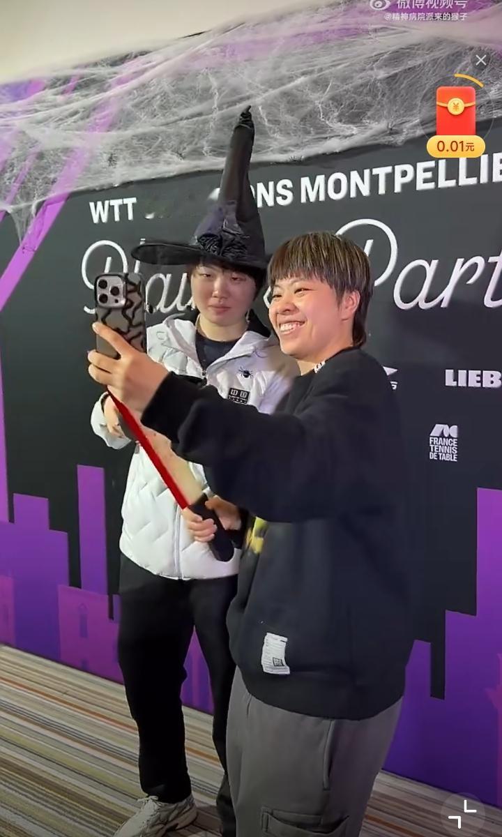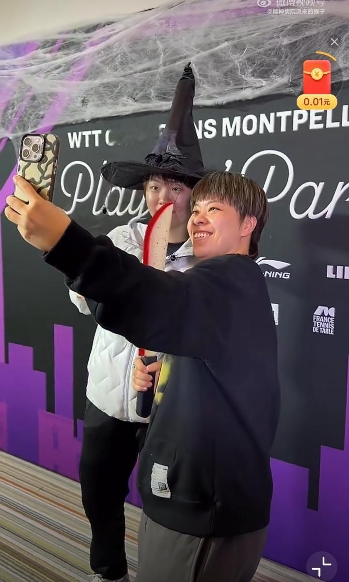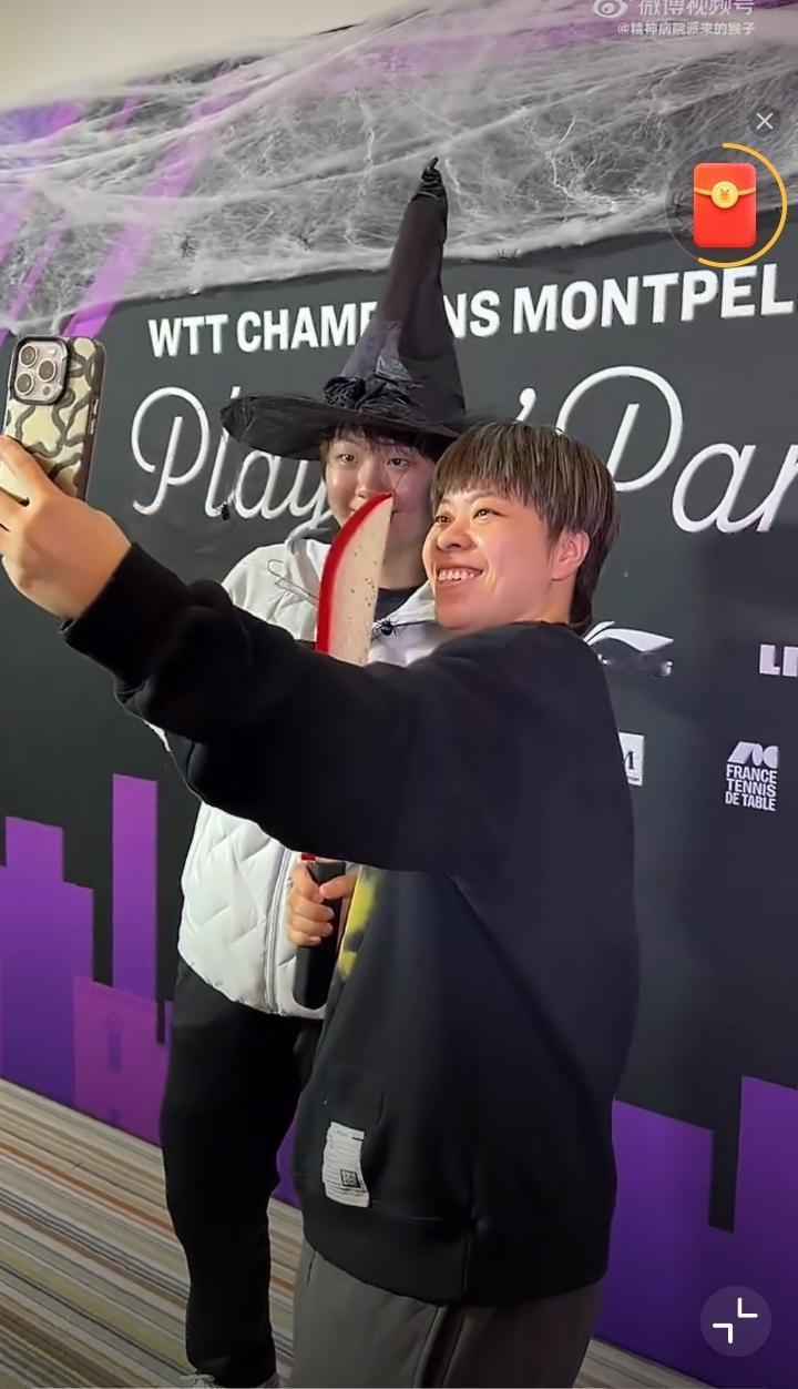 蒯曼这是啥造型啊?[赞][笑哭] 也只有大迪你举个刀拍照了[捂脸], 在我们昨晚睡得香甜的时候,法国那边的2025WTT冠军赛蒙彼利埃站举行了球员欢迎晚宴,看到了不少外国选手尤其是法国、德国选手的照片,但中日韩的照片确实不多[捂脸],中日韩选手被冷落了吗[捂脸]? 还好,细细找找,发现了我们的王艺迪和蒯曼,两个爱搞怪的孩子啊。 蒯曼这头上戴的帽子这么高,是什么角色造型?大迪举着刀刃泛红的刀是要在蒙彼利埃杀出一条血路吗?[捂脸]