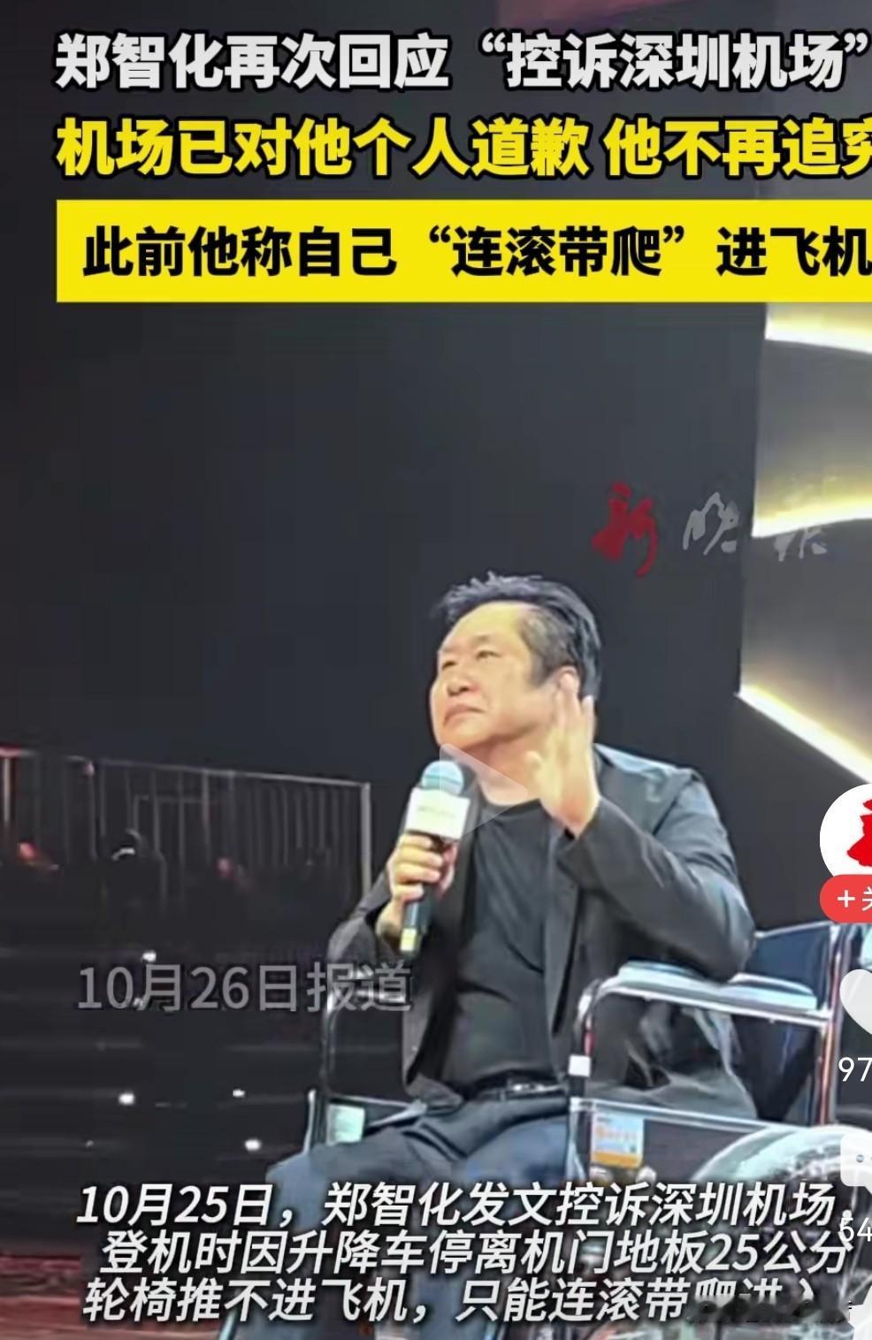 又反转了!郑智化先生道歉了,深圳机场也道歉了,有则改之无则加勉,和解就好。 加强两岸交流任重道远,人的思维本来就受环境,文化背景,生活方式等等因素的影响,以后多多交流和往来,就会慢慢适应和熟悉,争取事事都相处和谐顺利。 他也说,连滚带爬的用词,是他登机过程不顺,一时气愤的遣词,并表示真诚地道歉。大陆无障碍设施确实还有待提升,这一点,深圳机场立行立改,增人员并试点登机连接装置。郑智化也表示深圳机场已致歉将不追究此事。 人活着就有各种琐事,摩擦,有问题解决问题,有情绪平复情绪,互相包容最重要。行有不得,反求诸己,多学习古人的智慧,问题就会少很多。