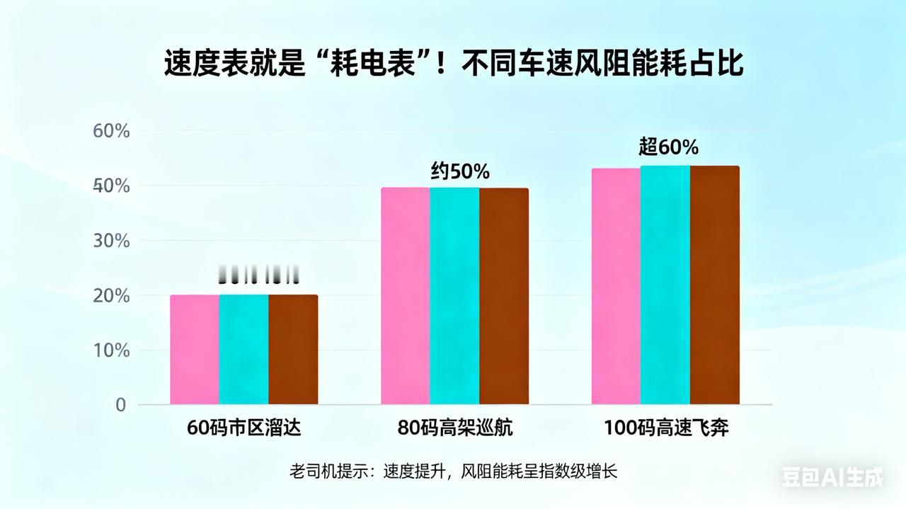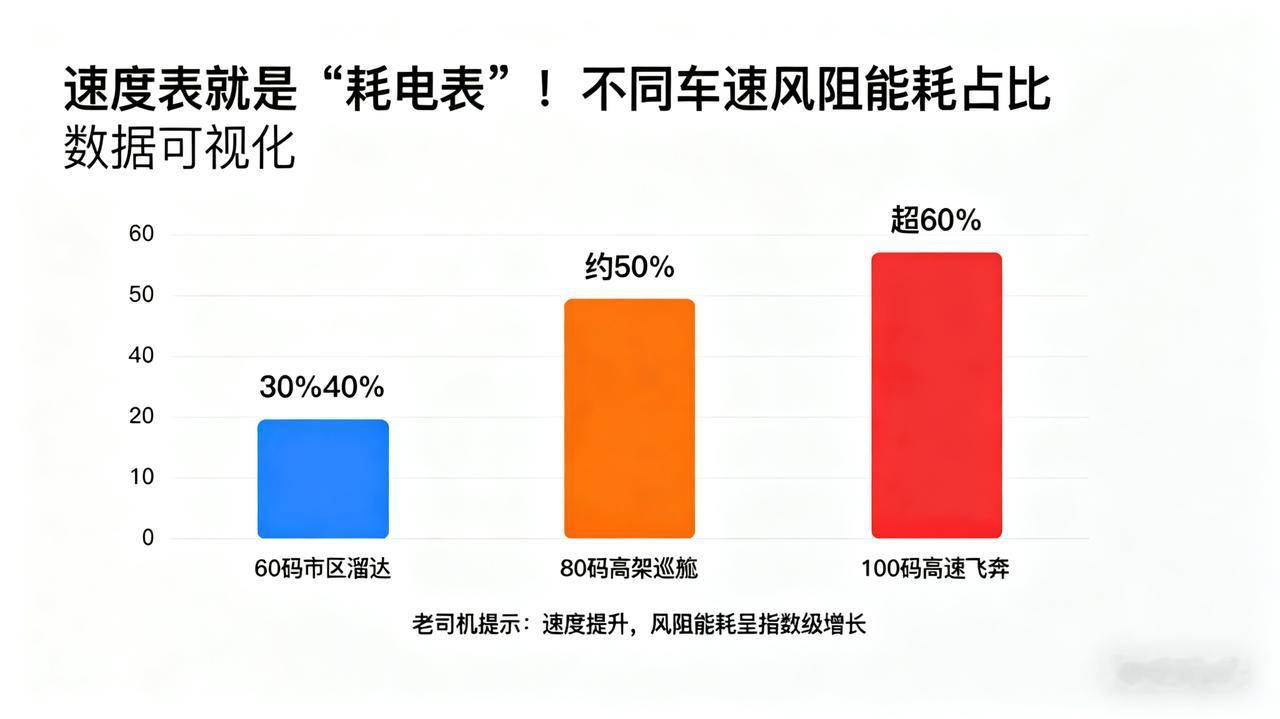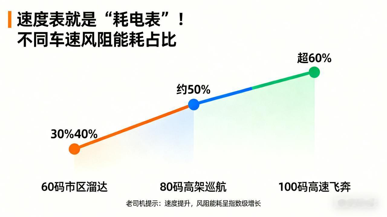 【60码、80码、100码,风阻偷走你多少电?】 余承东说120码时7成能耗用于对抗风阻,那日常速度呢?结论惊人: 60码市区溜达:风阻只是个“小弟”,占比约30%-40%。 80码高架巡航:风阻与轮胎摩擦“五五开”,吃掉一半电量(约50%)。 100码高速飞奔:风阻已成“电老虎”,能耗占比超60%! 老司机专业提示:速度每提升一点,风阻能耗呈指数级增长!这就是为什么电动车跑高速续航会“打骨折”的真正原因。 给车主的建议:想省电?除了轻踩电门,平稳驾驶,避免高速行驶!