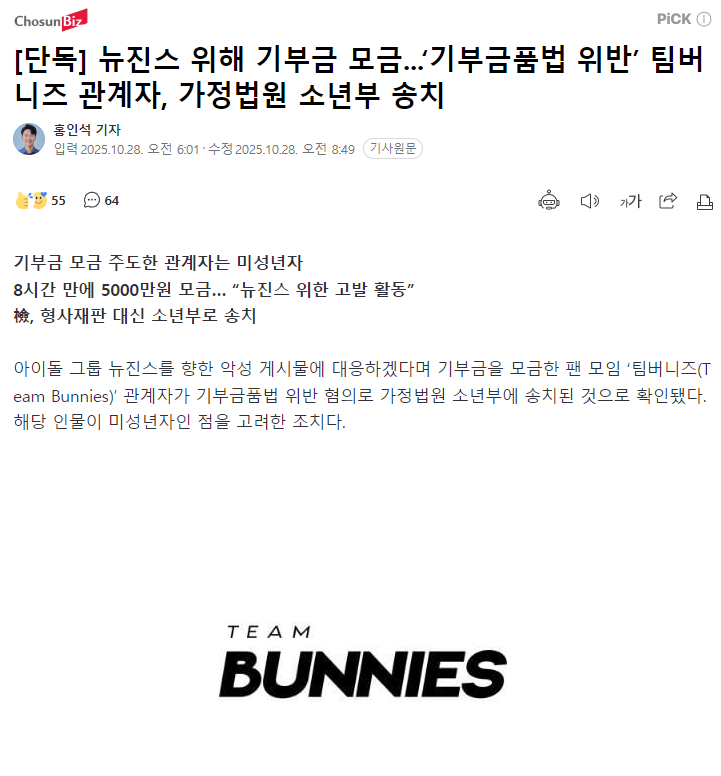 Team Bunnies是去年HYBE和ADOR矛盾激化的时期支持NewJeans而成立的粉丝团体。去年10月21日,他们以“将举报与NewJeans相关恶帖”为由,通过网络进行了募集捐款。募捐款项在8个小时内就超过了5000万韩元。然而很快,该募捐活动就被质疑违反《捐赠款物法》而引发了争议。
