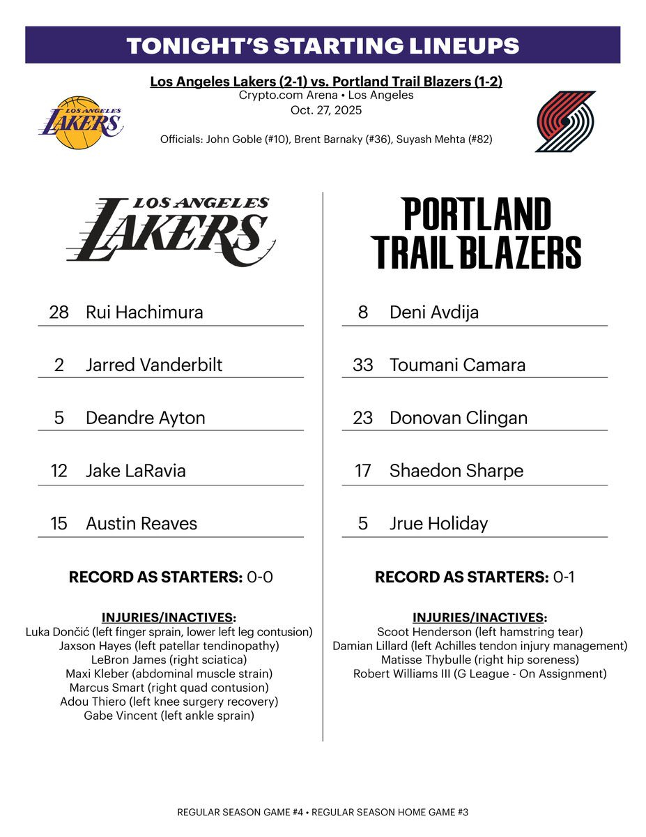 湖人今日首发:里夫斯、拉拉维亚、八村垒、范德比尔特、艾顿