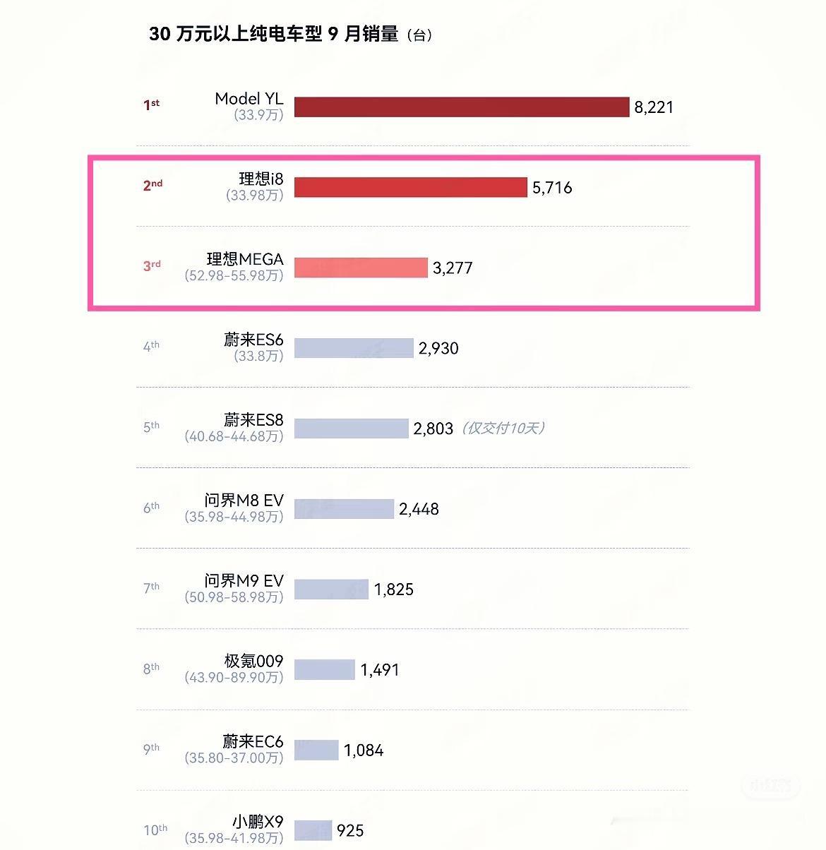 30万以上的纯电车型里谁卖的最好,第一名是特斯拉model y该车的销量地位绝对是毋庸置疑的,都过了这么多年了三电的配置还是那么的顶配 其次理想i8的销量5716辆,暂列30万级别销量的第二名,当前理想i8的销量已经满足李想的交付预期