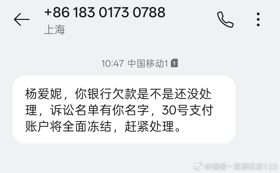 更奇葩的是另一张我用了十五年的老卡,最近也是莫名奇妙接受到关于杨爱妮的催收短信。