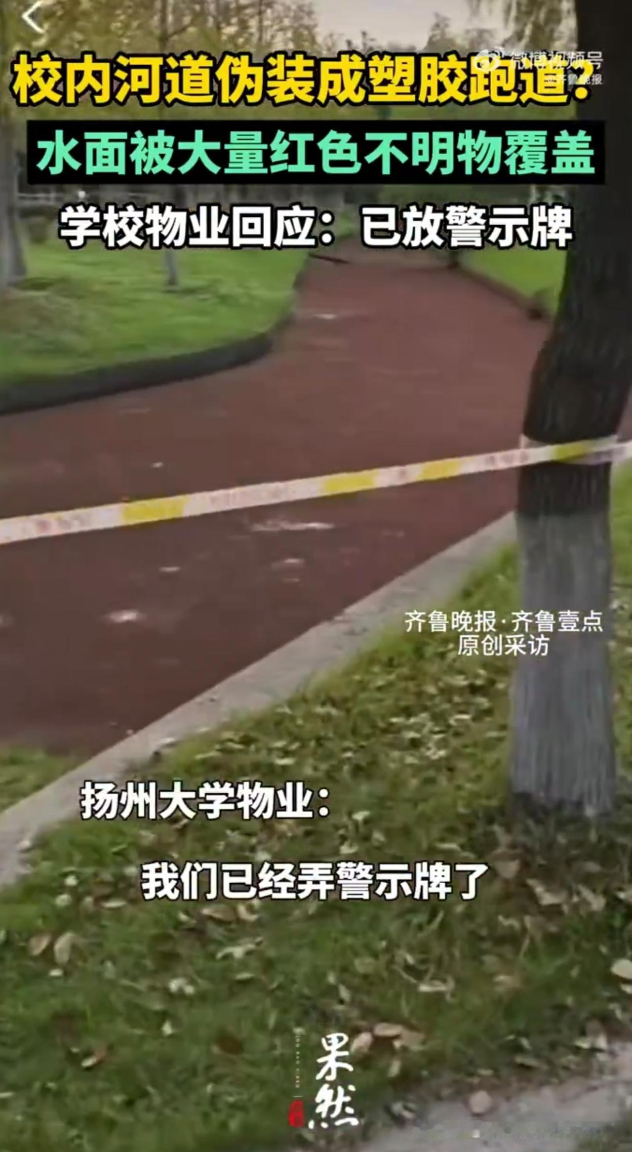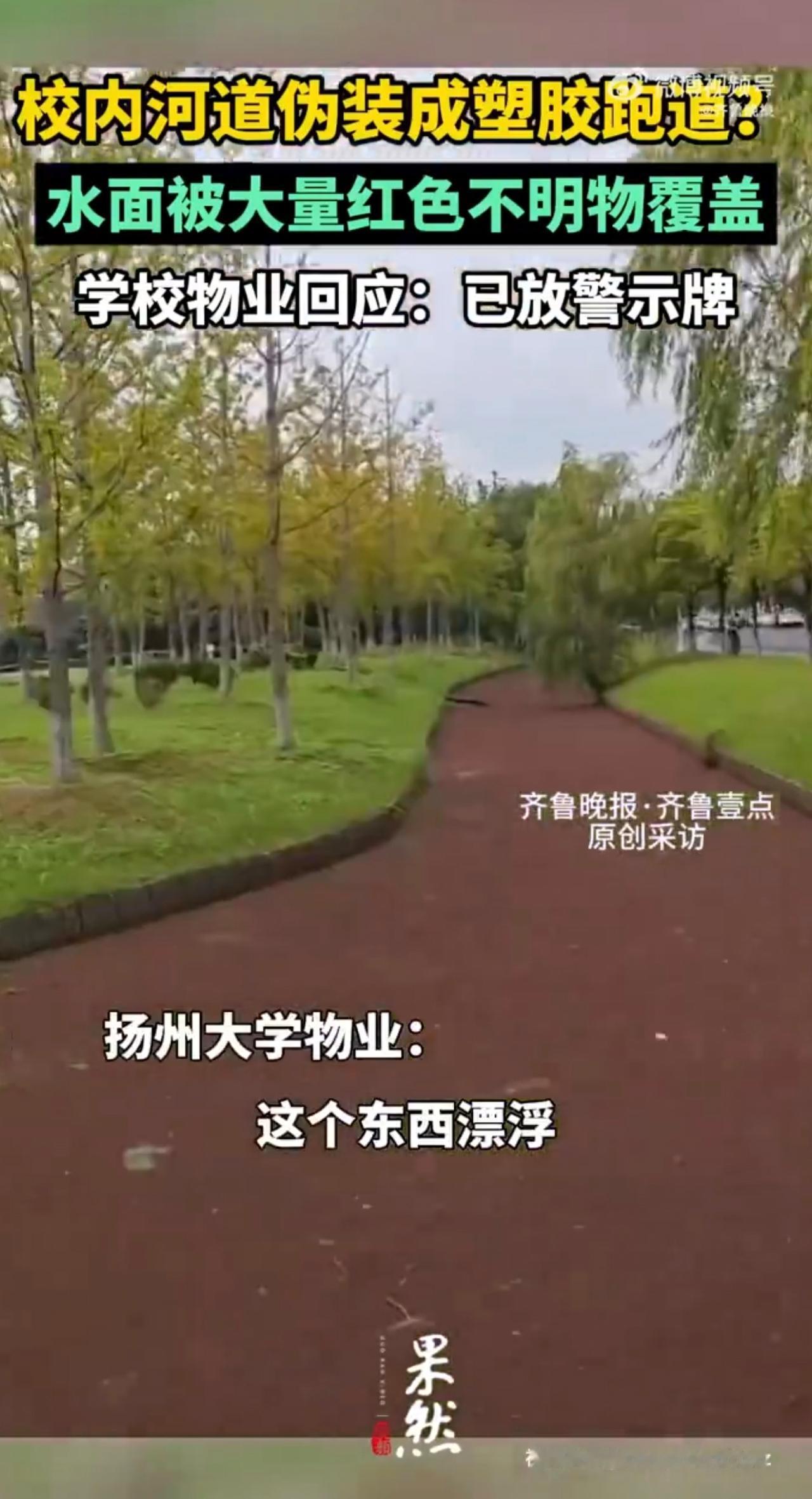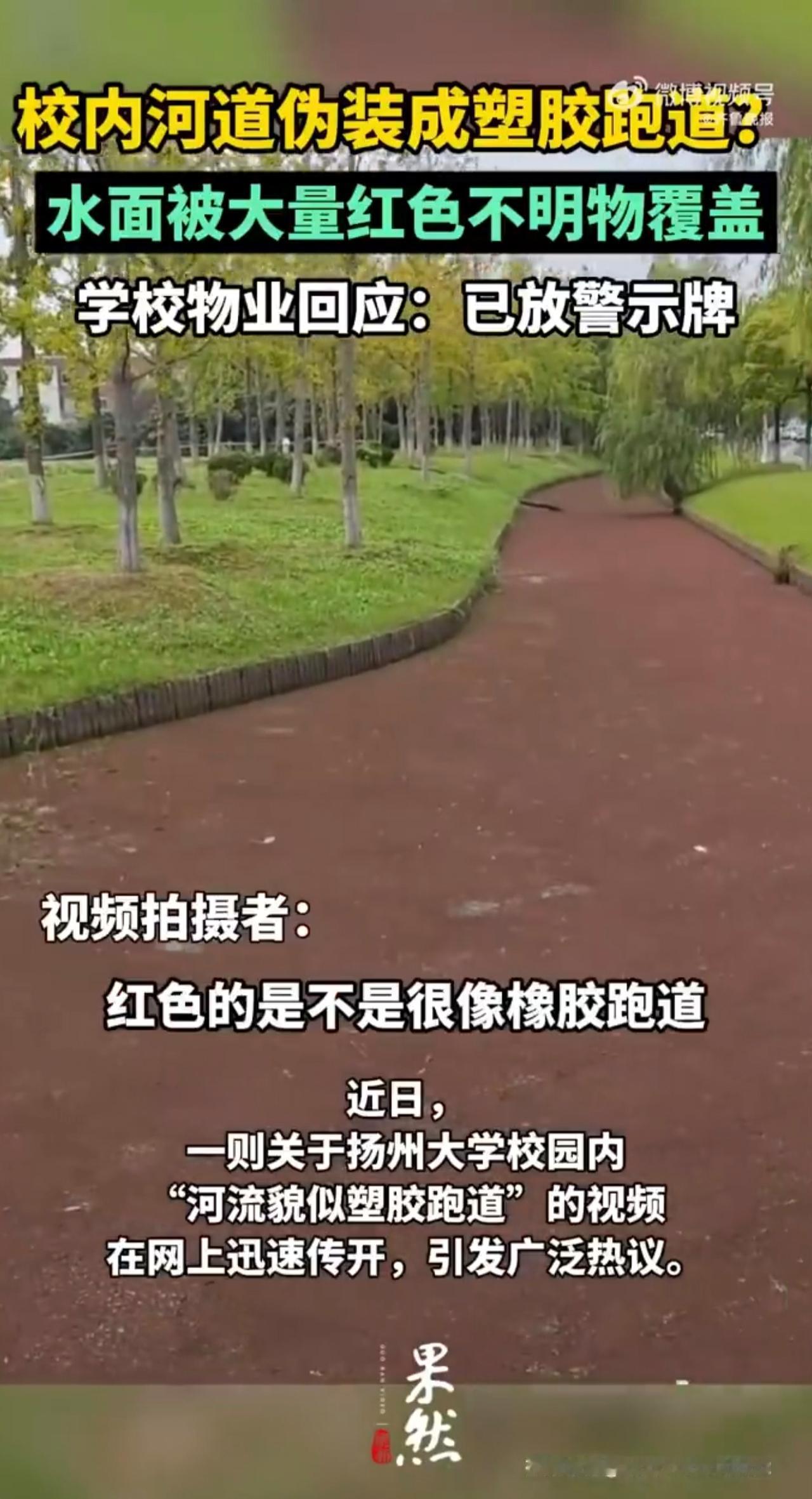 扬州大学一河段布满红色物后似“塑胶跑道”,学校物业:已放警示牌。