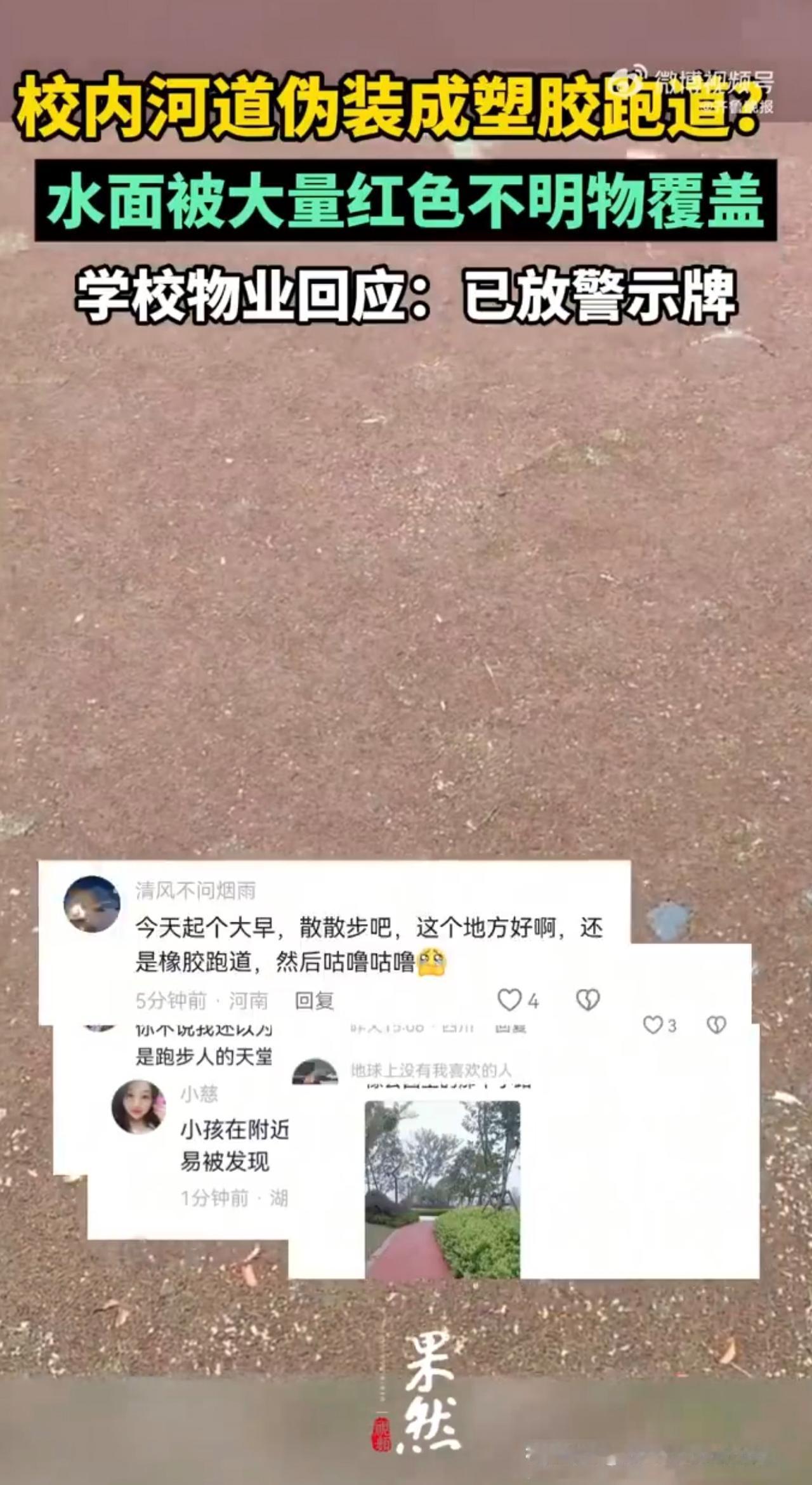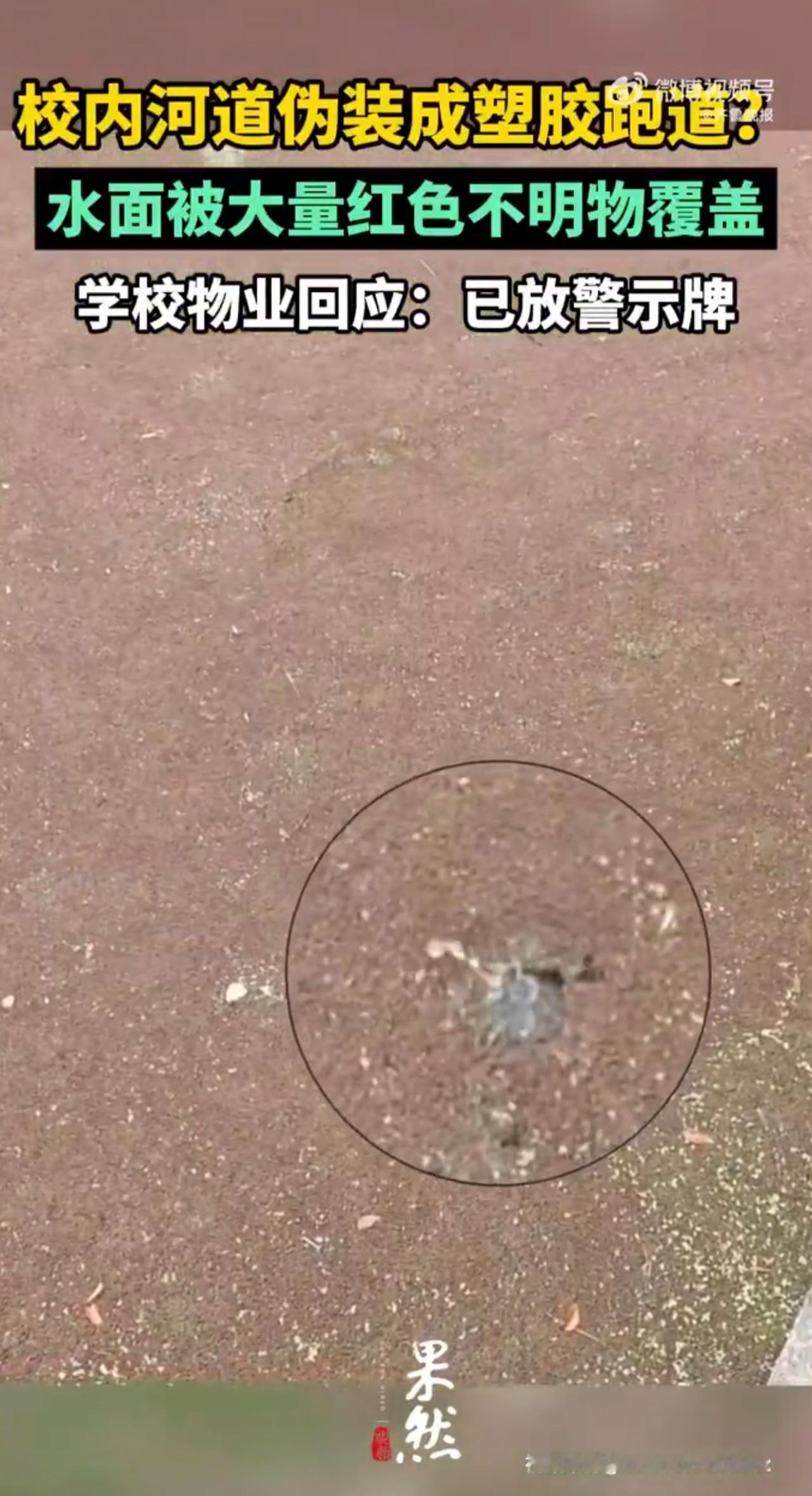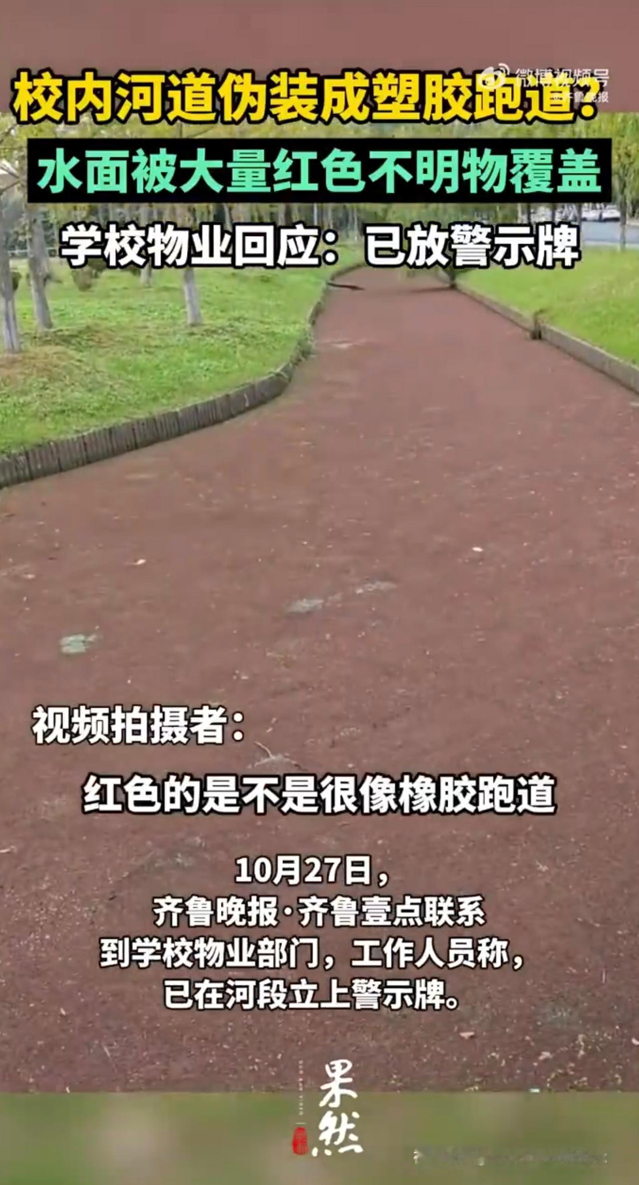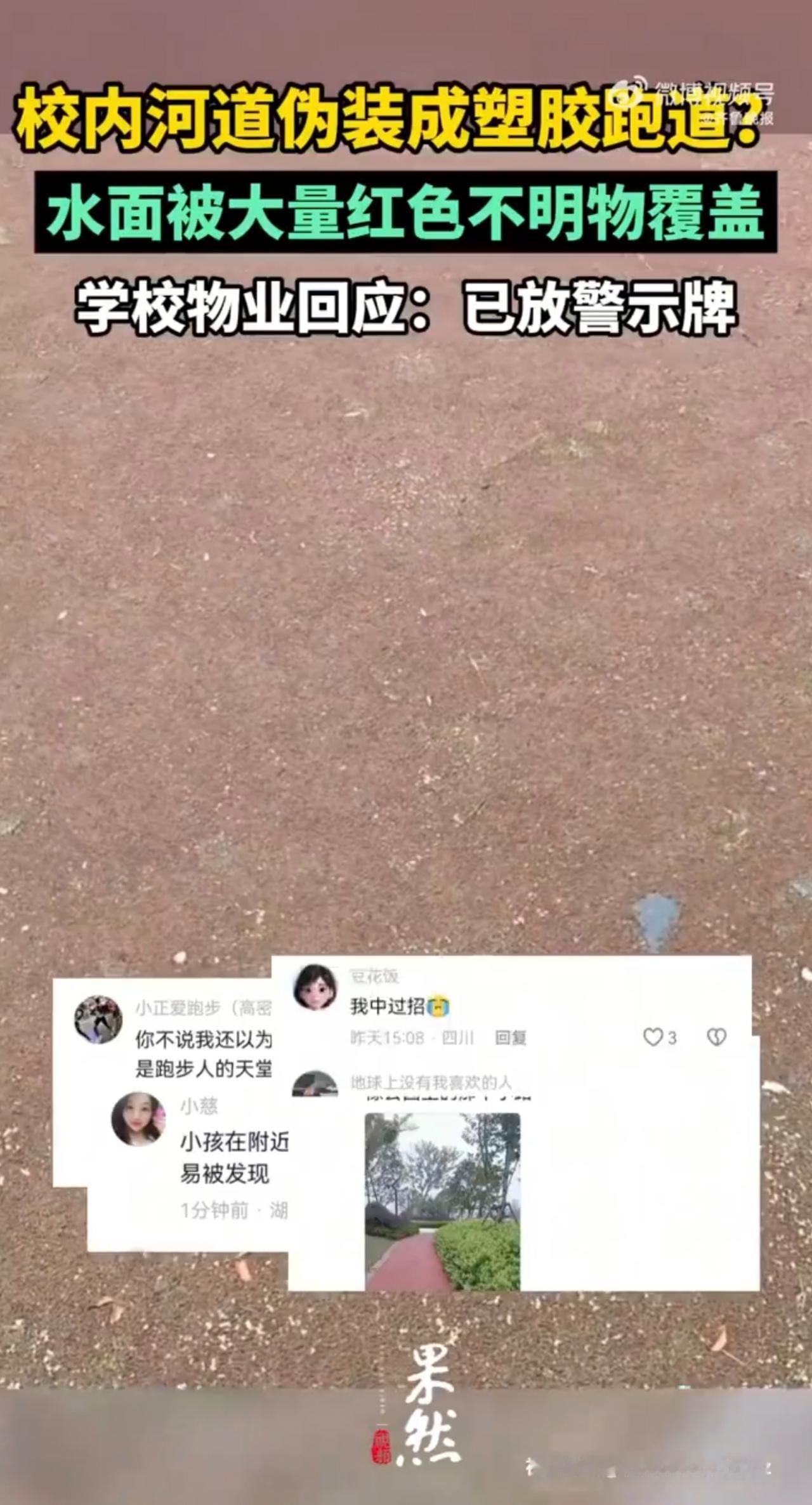 扬州大学一河段布满红色物后似“塑胶跑道”,学校物业:已放警示牌。