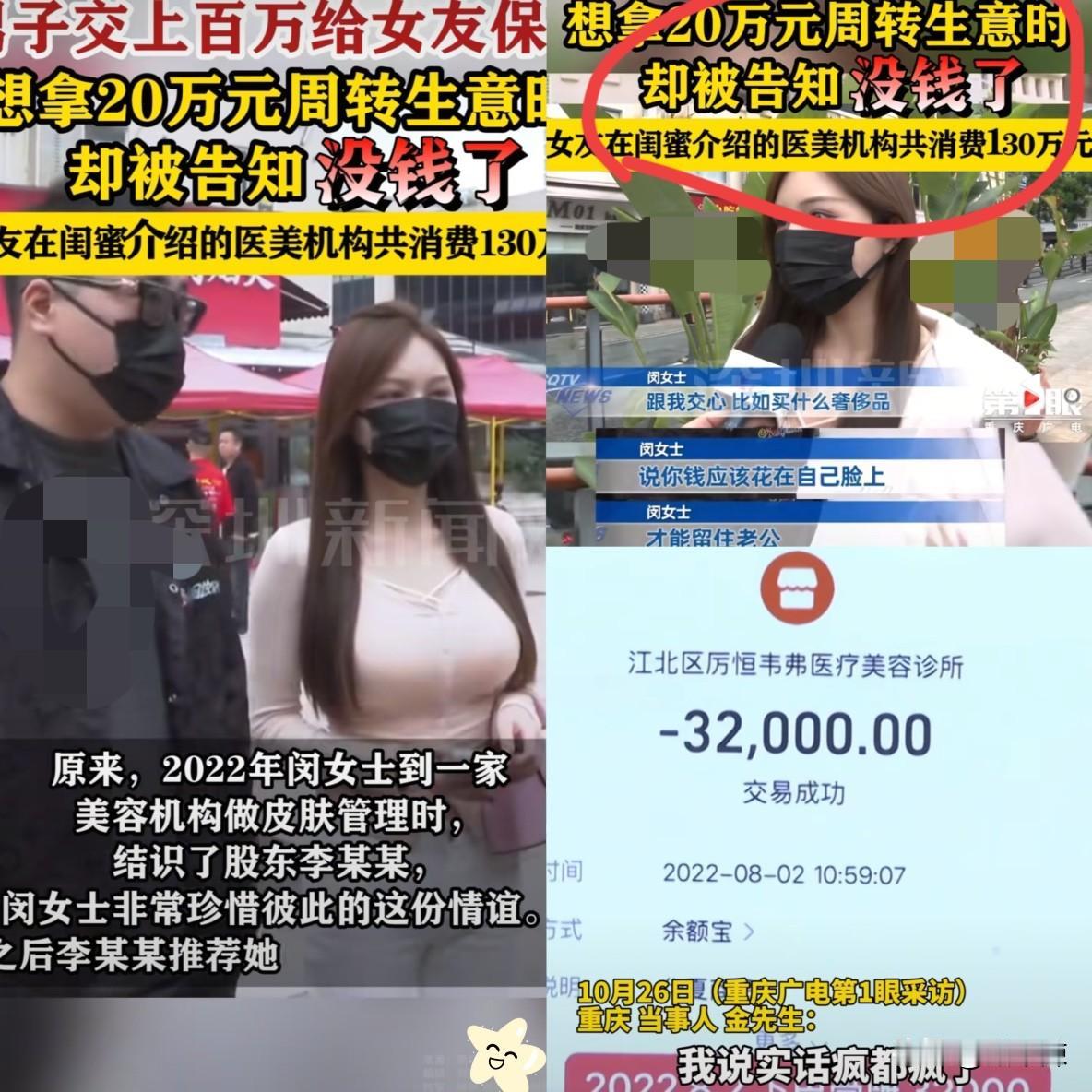 重庆,男子辛辛苦苦打拼,攒下200万全都交给女朋友保管,想着俩人好好过日子。结果生意急需周转要钱时,直接被浇了盆透心凉的冷水,说钱全被女友挥霍在脸上了! 三年里,女友被美容闺蜜天天撺掇,隔十天半月就扎进美容院,每次出手就是几万、十几万,200多万辛苦钱就这么打了水漂! 更坑人的是,一个成本仅12万的项目,她居然花了75万,而她那闺蜜,靠着拉她消费提成,都已经买房买车潇洒度日! 最后大哥费劲交涉,也只追回来56万,血亏140多万! 这事儿真给所有人提了个醒:感情里的信任从来不是单向透支,再好的关系,也经不住毫无底线的挥霍,更别轻易把全部身家托付给别人! 真心换不来真心不可怕,可怕的是盲目信任错付了人?
