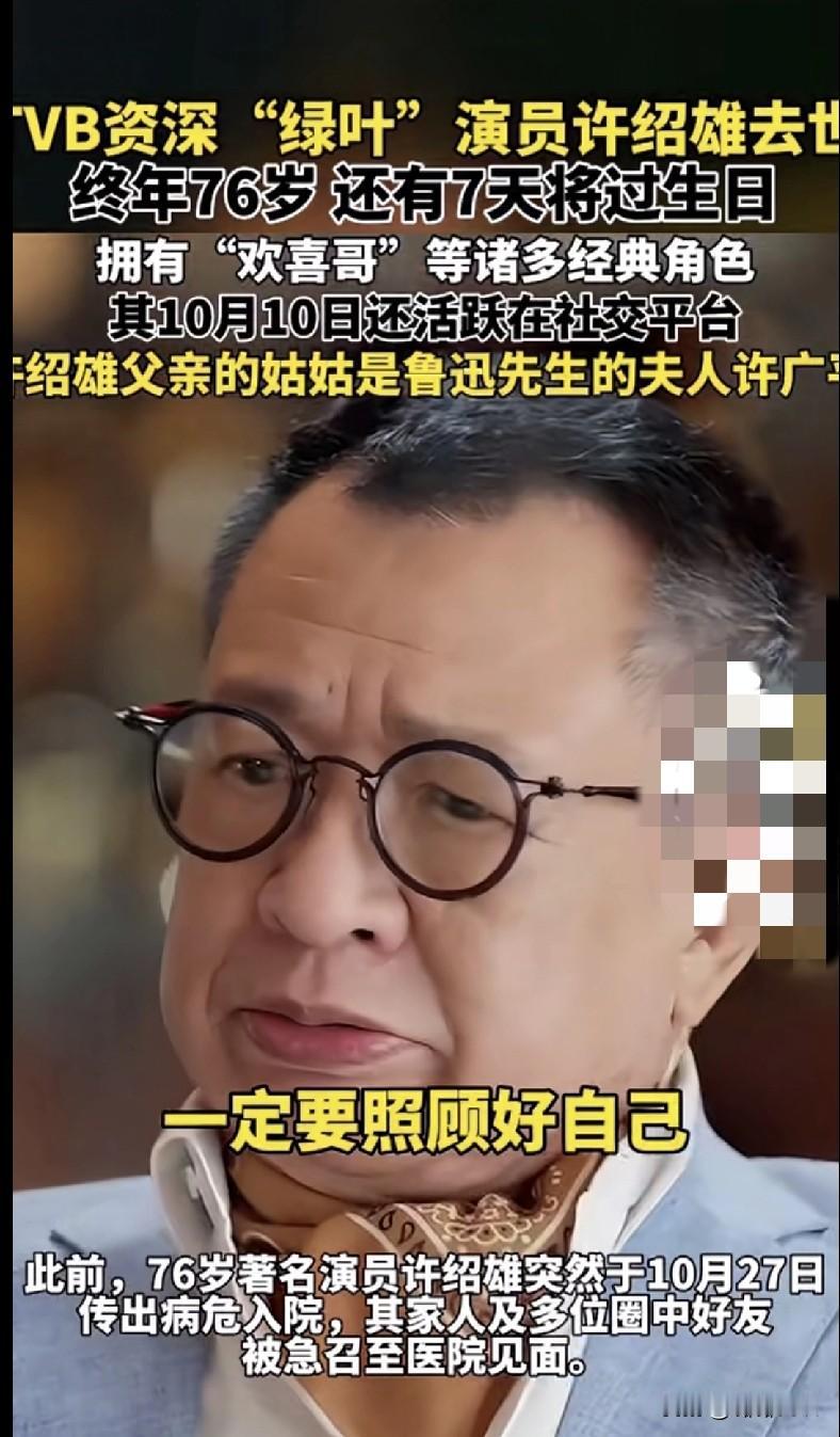 “天呐!TVB金牌绿叶许绍雄走了,才76岁,离生日就差7天…多少人是看着他的戏长大的啊!‘欢喜哥’的形象刻进DNA了,他演的那些配角比主角还出彩! 更让人意外的是,他还是鲁迅夫人许广平的侄孙,这身世太绝了!10月10号还在社交平台活跃,突然就病危去世,真的太突然了… 他在TVB演了一辈子绿叶,却成了我们心中的黄金主角。以后再看港剧,少了这位可爱的大叔,总觉得少了点什么…一路走好啊欢喜哥,感谢你留下这么多经典角色,我们会一直记得你的!”