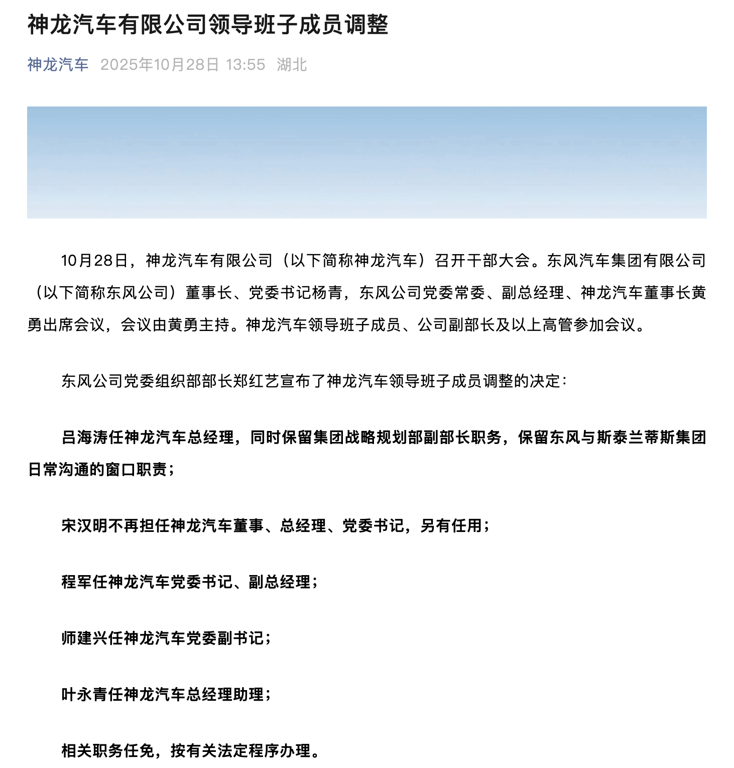 吕海涛任神龙汽车总经理,同时保留集团战略规划部副部长职务,保留东风与斯泰兰蒂斯集团日常沟通的窗口职责;