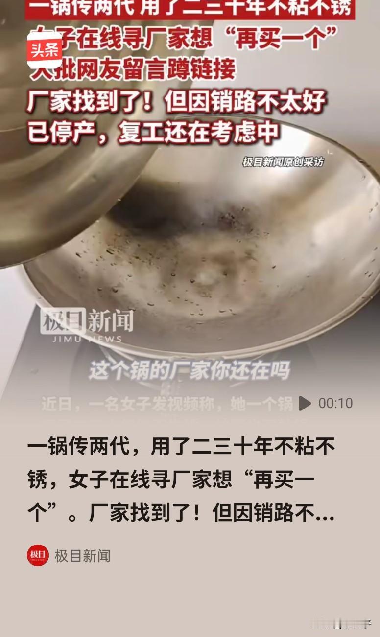 “一锅传两代”,女子家的锅很有历史,想再买一个新锅时,却发现厂家停产了。果然应了那句话。 实在人做不了生意,商人必须奸猾。 女子把这事拍成视频,意外地火了。网友们帮忙联系到了厂家。厂家的回复,让人听了动情。 厂家说了很多感谢的话,他庆幸自己这么多年坚持质量第一,终于得到了肯定。自己不是不会那些偷奸耍滑的手段。只是觉得那样做。 丧良心。但自己也被现实狠狠上了一课。网友们纷纷点赞支持,说赶紧上链接,一定买一口支持。厂家表示。 认清考虑一下,争取早日复工。网友们说,真的很感动,这样的商家就应该能够赚大钱。怎么会倒闭呢。 相比之下,那些粗制滥造,质量不过关的厂家,却活得有滋有润,真是没法说了。 真希望这样的厂家能够再多一些。 你家有使用多年仍好用的锅具吗 一锅传两代不粘不锈 厂家称已停产