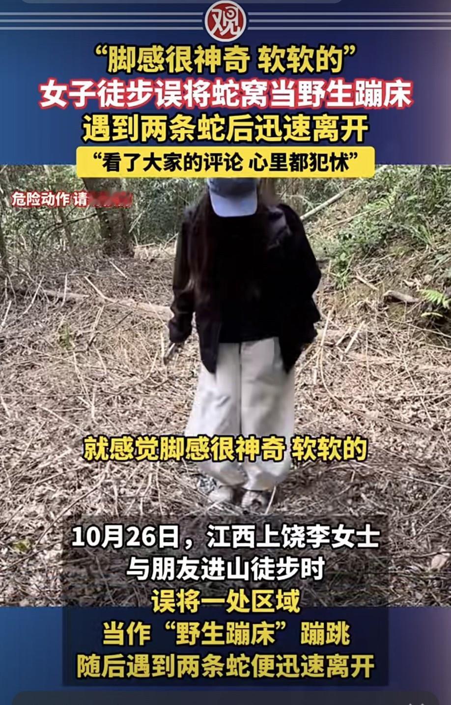 10月26日,江西上饶的李女士经历了一场与危险的擦肩而过。她和朋友进山徒步,误把一处蛇窝当成“野生蹦床”蹦跳。随后遇到两条蛇,一条颜色像木棍,一条脑袋扁扁,两人赶紧撤离。当时山里没信号,她们徒步拍摄近三小时,遇蛇后撤离就花了一个半小时。她发视频后才知道踩的是蛇窝。李女士后怕地说,要是被咬,山里难走,车进不去,根本没法求助。 A网友:话说,在野外碰到这种踩上去软绵绵有弹性的,大多数人下意识的会认为是陷阱,或者其它未知的危险而选择远离。她倒好,还在上面跳几下,脑子是被门夹了还是被馿踢了? B网友:胆子真大。还好她带了压蛇帽,不然后果不堪设想。对待大自然中一切不合常理的事情,都要有敬畏之心,不要做不作死就不会死的事。 C网友:小仙女驾到,通通给我避让,千错万错,仙女没错,就算捅破了天,总能找到别人的错,总有人兜底! 只能说真的命大,唯一筑巢的蛇是什么蛇?眼镜王蛇啊!神经毒素和血液毒素的集合体,一口就凉,没有血清。而且这种蛇是唯一会追人的蛇,所以也俗称叫“过山峰”,意思是追人能追过一座山峰,陆地毒蛇的天花板,成年王蛇,无下天敌。夏季蛇类活跃,大家去户外可得做好防护,可别像李女士一样误踩“陷阱”了。