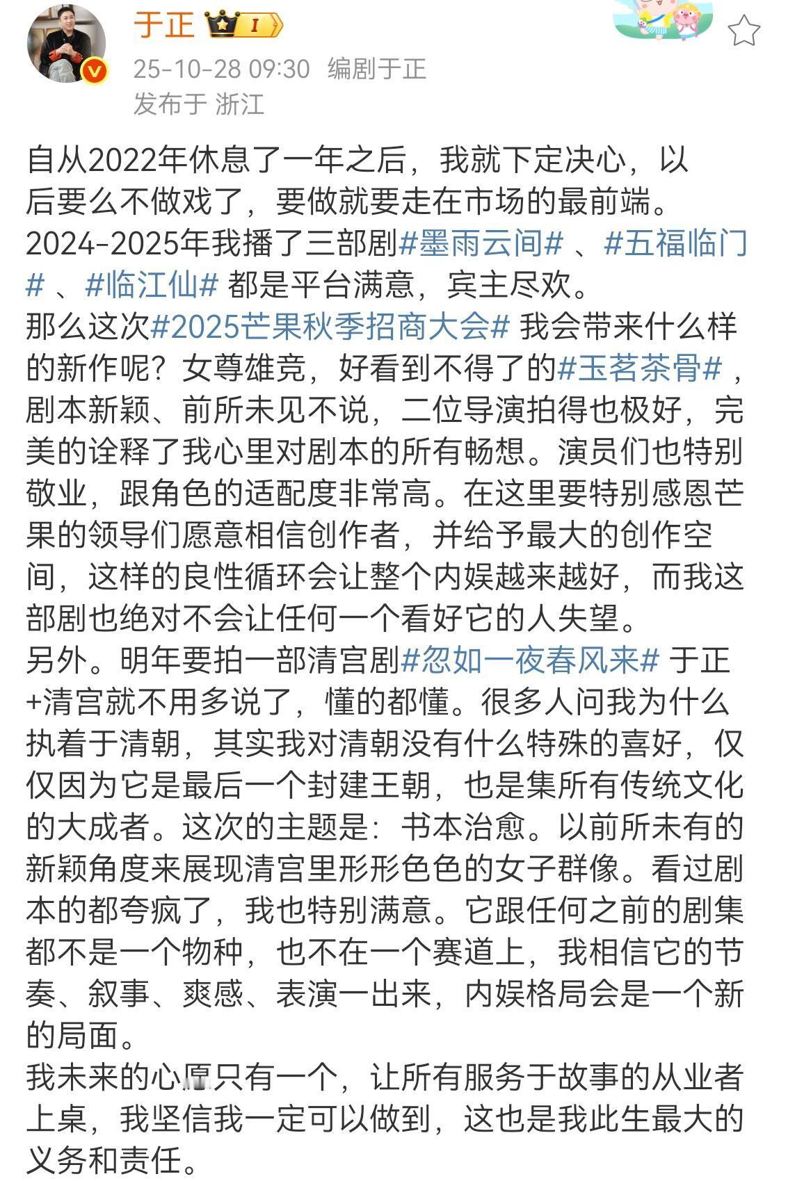 于正明年要拍一部清宫剧《忽如一夜春风来》