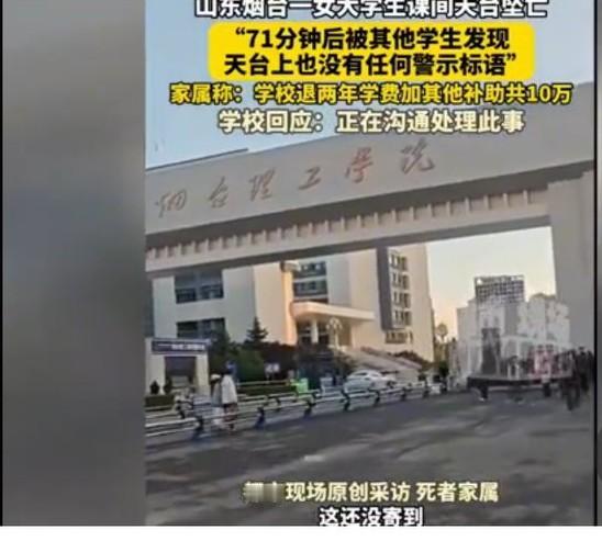 烟台坠落女生因为校方补偿10万元,家属不同意。把花圈放在学校门口。十万元确实少,那是一条鲜活的生命。是在校园内发生的事情,家长把孩子放心交给你们学校,结果孩子出事一个半小时躺在水泥地。没有人发现,等孩子凉透了没有抢救的喜希望了。校方才发现,那个家长能把这口气咽下去。