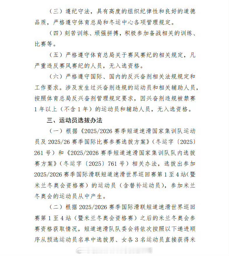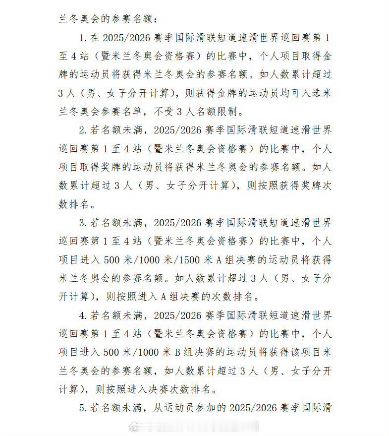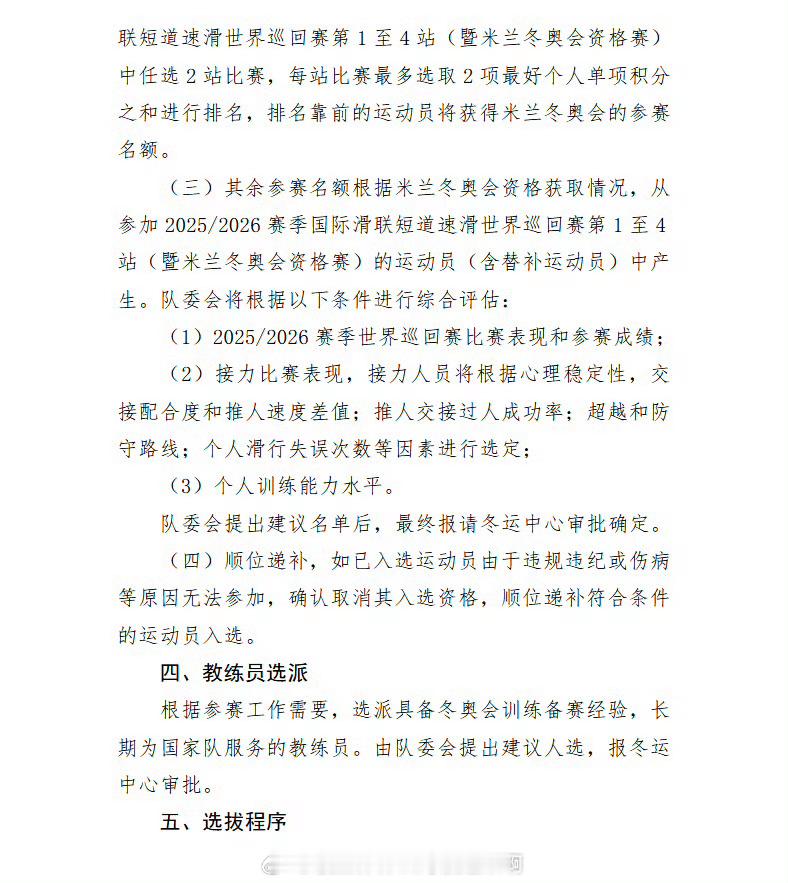 ✍️为公平公正选拔2026米兰冬奥会短道速滑选手,国家队将依据2025/2026赛季前四站世界巡回赛(即奥运资格赛)成绩,个人项目金牌得主直接获奥运席位(男女各超3人亦全部入选);队委会综合评估赛季表现、接力配合、训练水平等,若已选队员因违纪或伤病退出,则顺位递补。 2026冬奥会倒计时100天