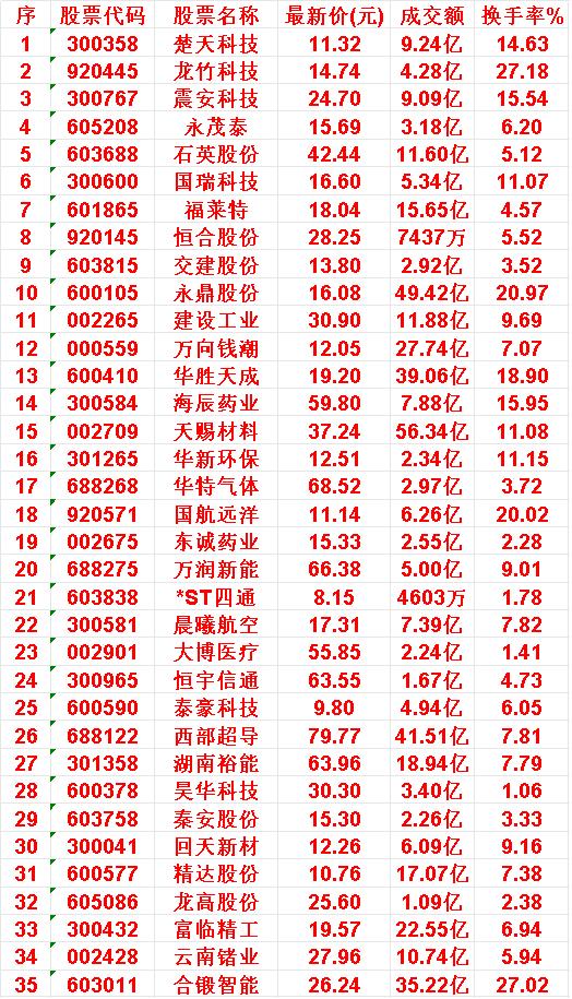 10月28日,KDJ日线金叉的35名单汇总 楚天科技:最新价 11.32元,成交额 9.24亿元 龙竹科技:最新价 14.74元,成交额 4.28亿元 震安科技:最新价 24.70元,成交额 9.09亿元 永茂泰:最新价 15.69元,成交额 3.18亿元 石英股份:最新价 42.44元,成交额 11.60亿元 国瑞科技:最新价 16.60元,成交额 5.34亿元