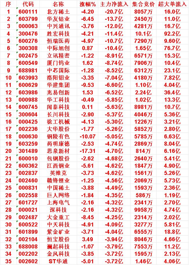 10月28日收盘,主力趁冲高,已经大幅卖出的35名单: 北方稀土:主力净流出 20.7亿元 华友钴业:主力净流出 13.7亿元 中兴通讯:主力净流出 12.0亿元 胜宏科技:主力净流出 11.4亿元 恒瑞医药:主力净流出 10.7亿元 中际旭创:主力净流出 10.4亿元 立讯精密:主力净流出 8.91亿元 厦门钨业:主力净流出 8.74亿元 中芯国际:主力净流出 8.52亿元 洛阳钼业:主力净流出 7.04亿元 华建集团:主力净流出 6.60亿元 兆易创新:主力净流出 6.52亿元 华工科技:主力净流出 5.85亿元 闻泰科技:主力净流出 5.63亿元 长川科技:主力净流出 5.37亿元 徐工机械:主力净流出 5.30亿元 10月28日收盘,主力资金“大幅买入”的35强: N禾元-U:主力净流入 17.6亿元,超大单流入 9.34亿元 N奕材-U:主力净流入 12.7亿元,超大单流入 5.15亿元 长城军工:主力净流入 11.0亿元,超大单流入 17.6亿元 三花智控:主力净流入 9.94亿元,超大单流入 51.4亿元 多氟多:主力净流入 9.45亿元,超大单流入 21.7亿元 方正科技:主力净流入 7.64亿元,超大单流入 21.3亿元 天赐材料:主力净流入 5.58亿元,超大单流入 10.1亿元