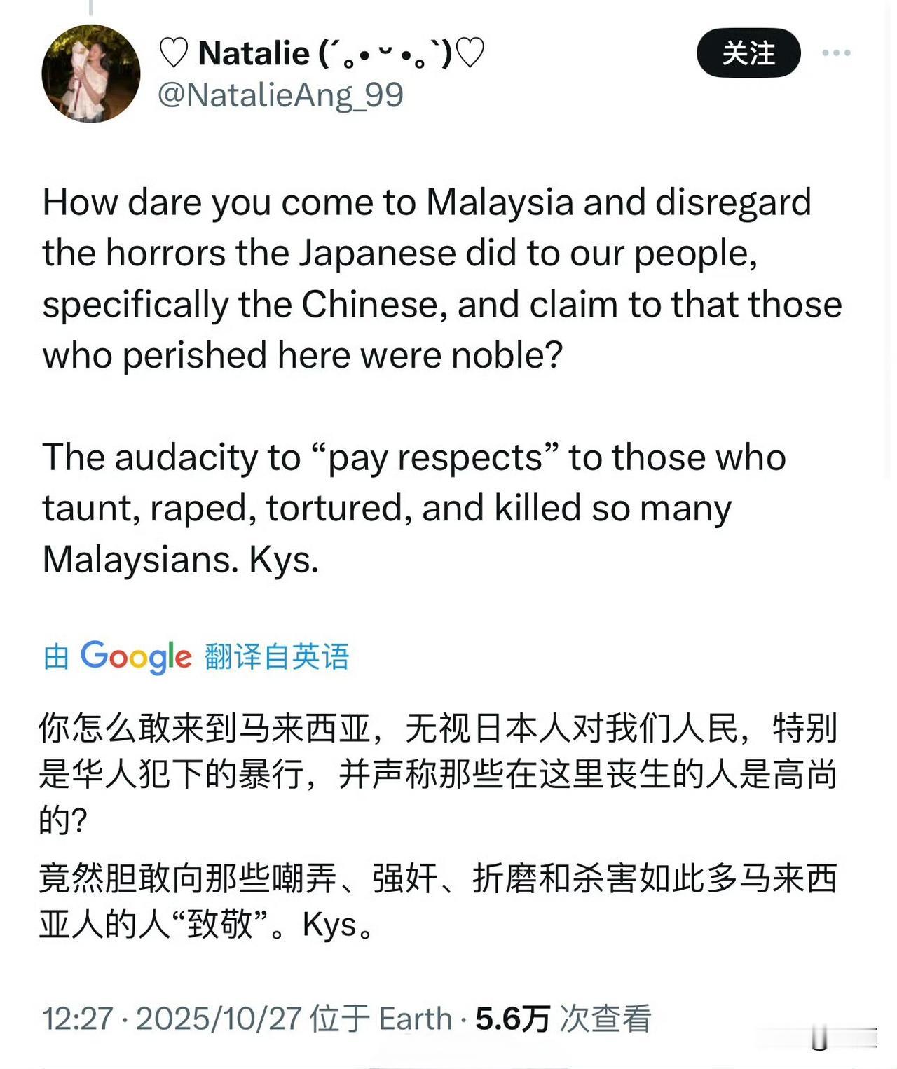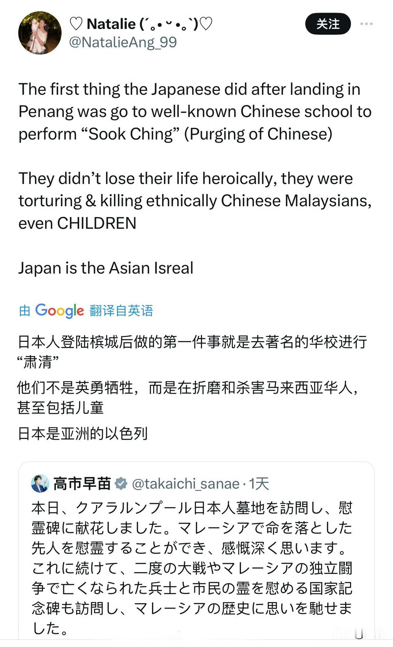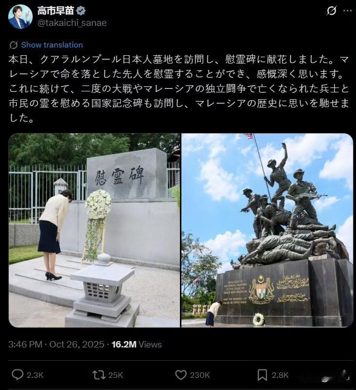 高市早苗第一次出访就干了件符合其人设的事……2025年10月25日,高市早苗在出席东盟峰会期间,前往吉隆坡的日本公墓献花,并在日语贴文中写道:“能在马来西亚缅怀我们的先人,我感到十分感动”。她的这一行为引发了马来西亚民众的强烈不满,被批评“无视历史、言辞冷漠”,认为她忽略了日本在二战期间对马来亚的残酷占领历史。 该公墓历史可追溯至19世纪,安葬着不同时期在马来西亚去世的日本人。包括19世纪末被贩卖至马来西亚的日本年轻女性,以及1941-1942年在战场阵亡的日本士兵,还有1977年飞机失事遇难的34名日本乘客等。