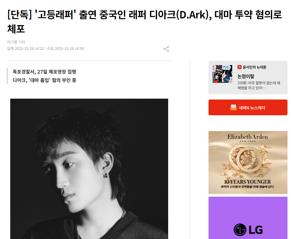 因出演Mnet《高等Rapper》、《SHOW ME THE MONEY 777》等而出名的Rapper D.Ark因涉嫌流通和吸食大麻而被逮捕。